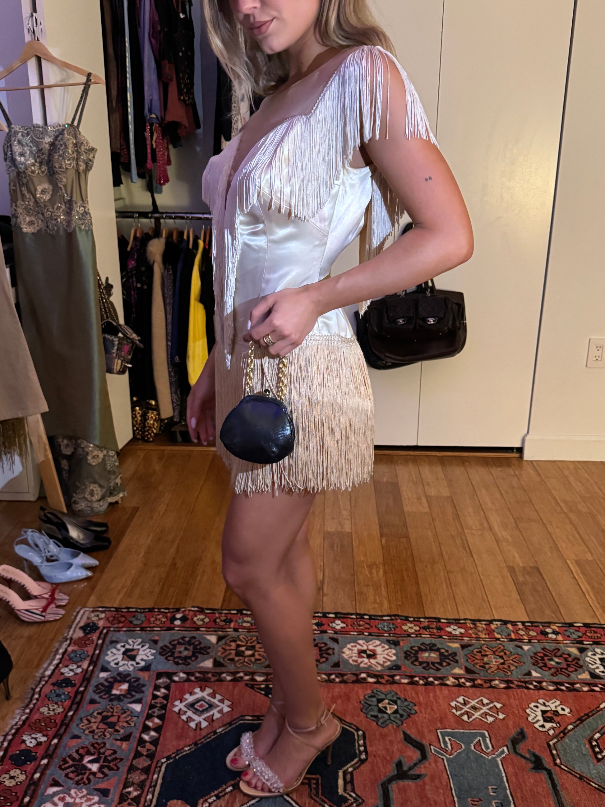 A rare 1960s silk fringe flapper-style mini dress playsuit, directly from a true showgirl’s personal wardrobe.