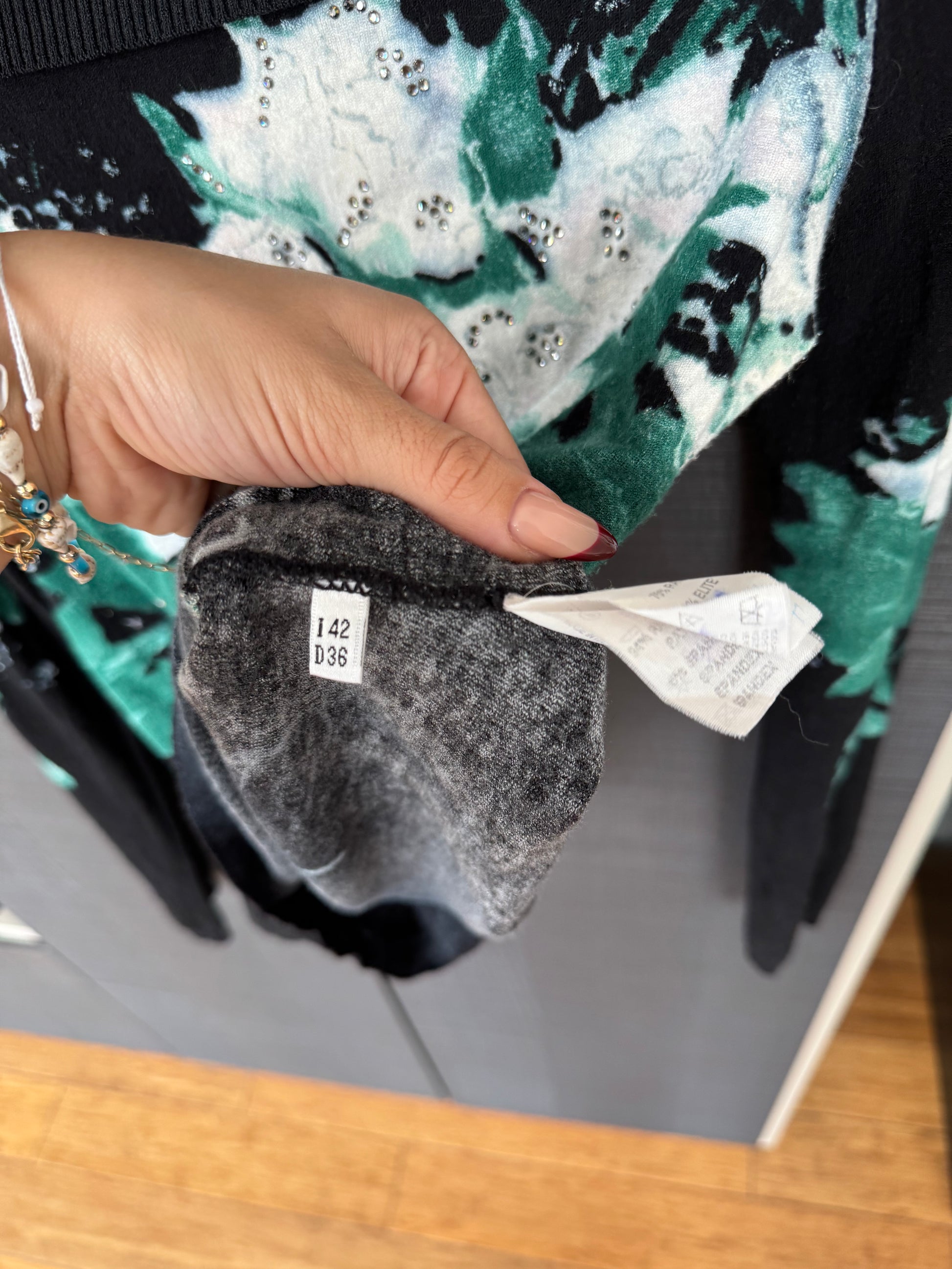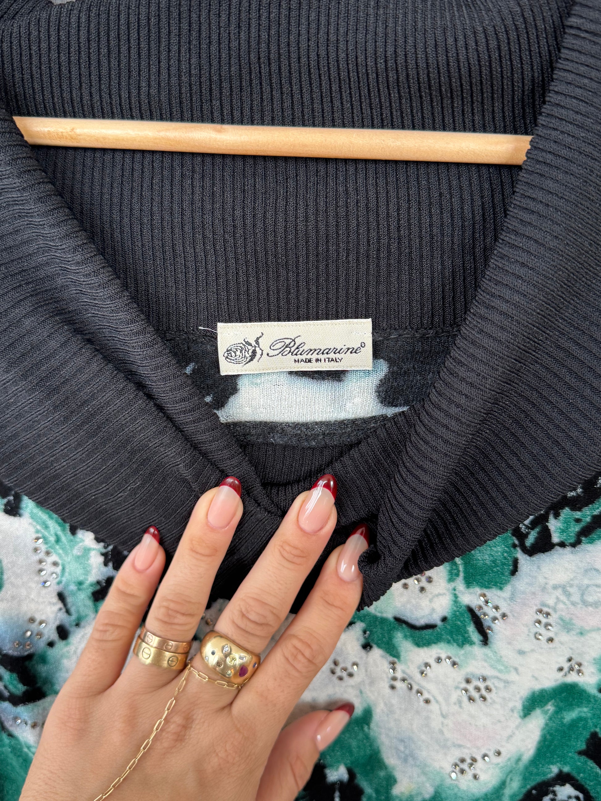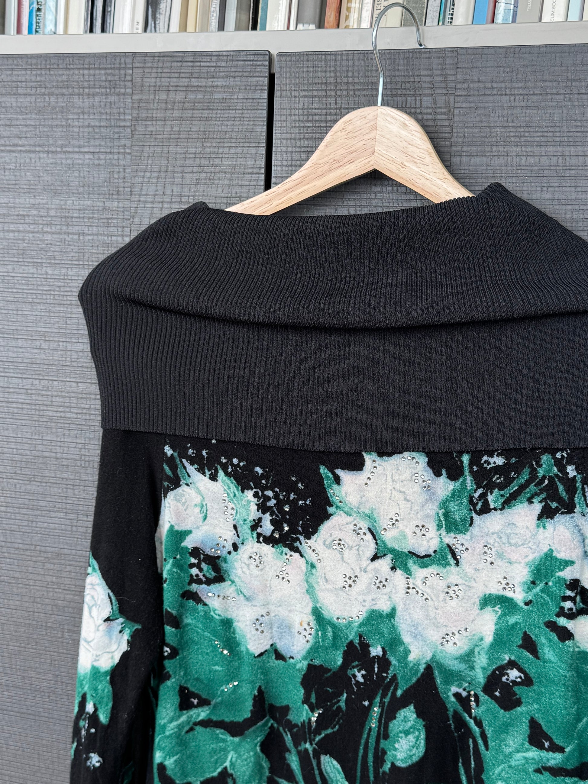Romantic vintage Blumarine fold over off-the-shoulder sweater in black, featuring a lush white rose and green foliage print.