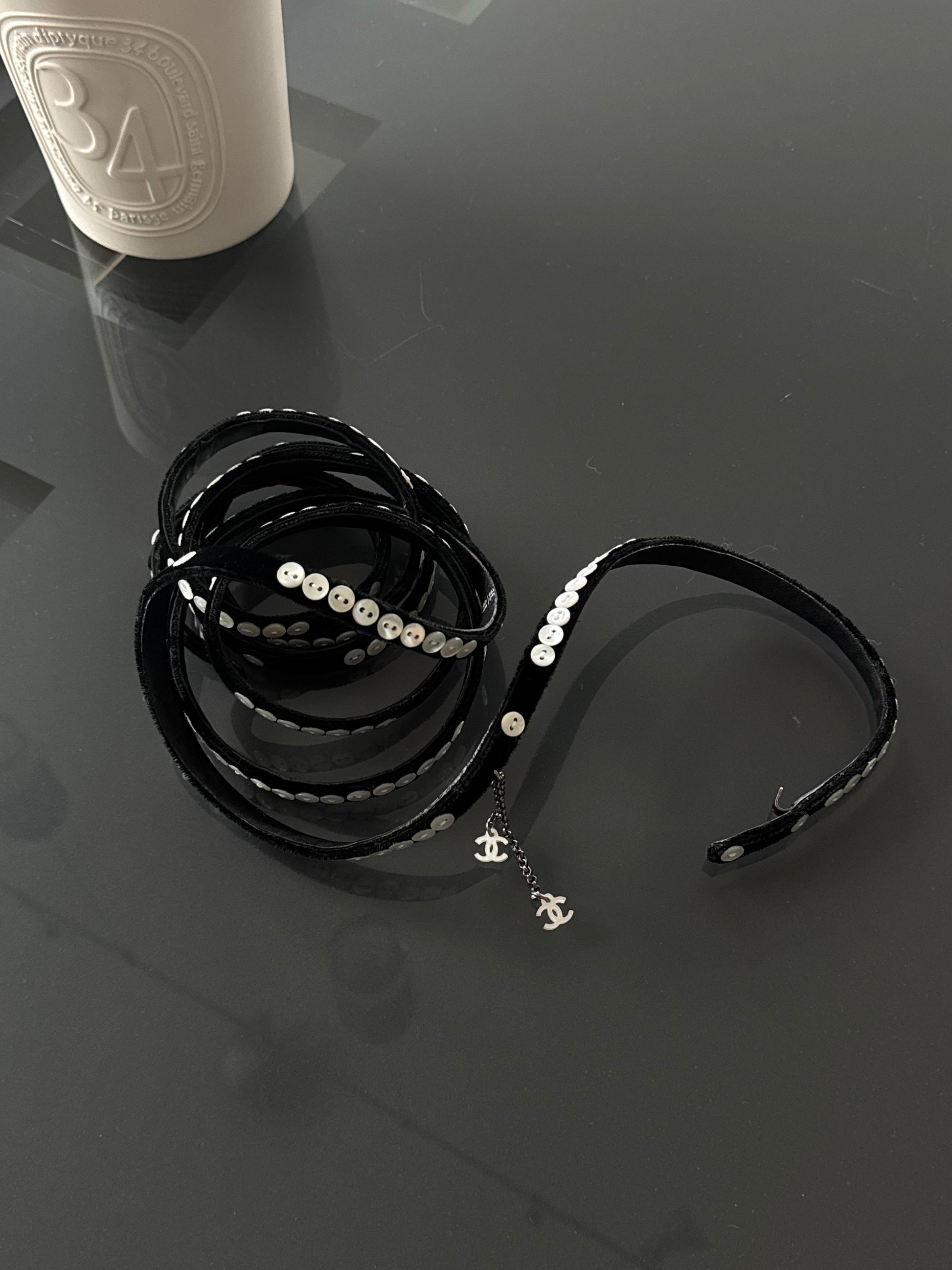 Designed in sleek black velvet and embellished with delicate pearl-style buttons throughout, this statement belt features signature interlocking CC charms that drape elegantly at the front.