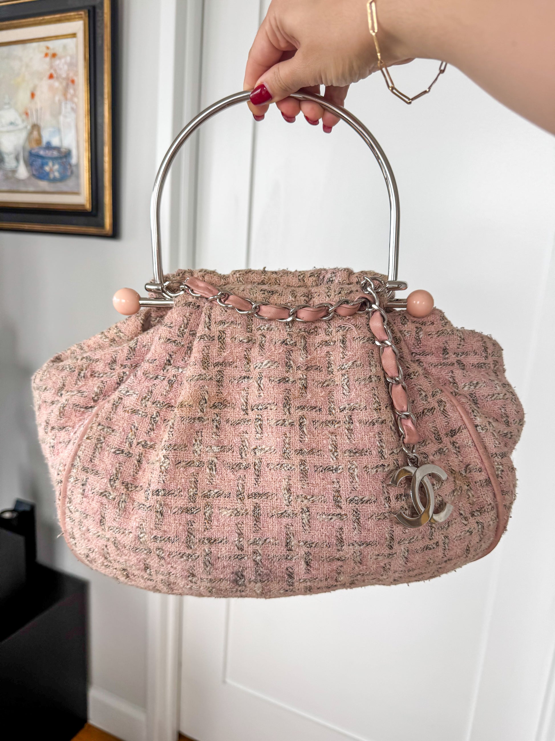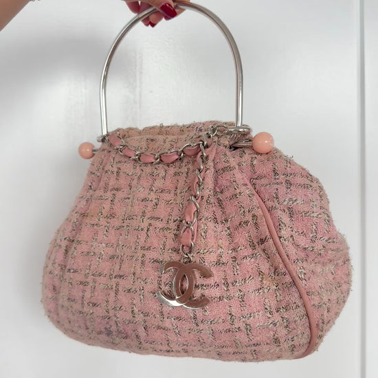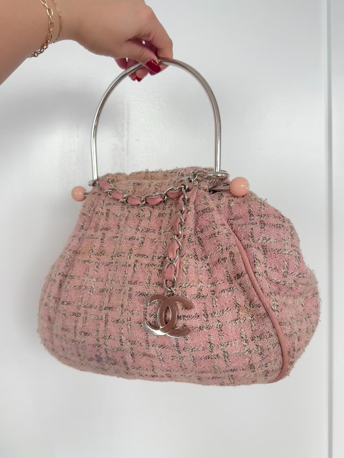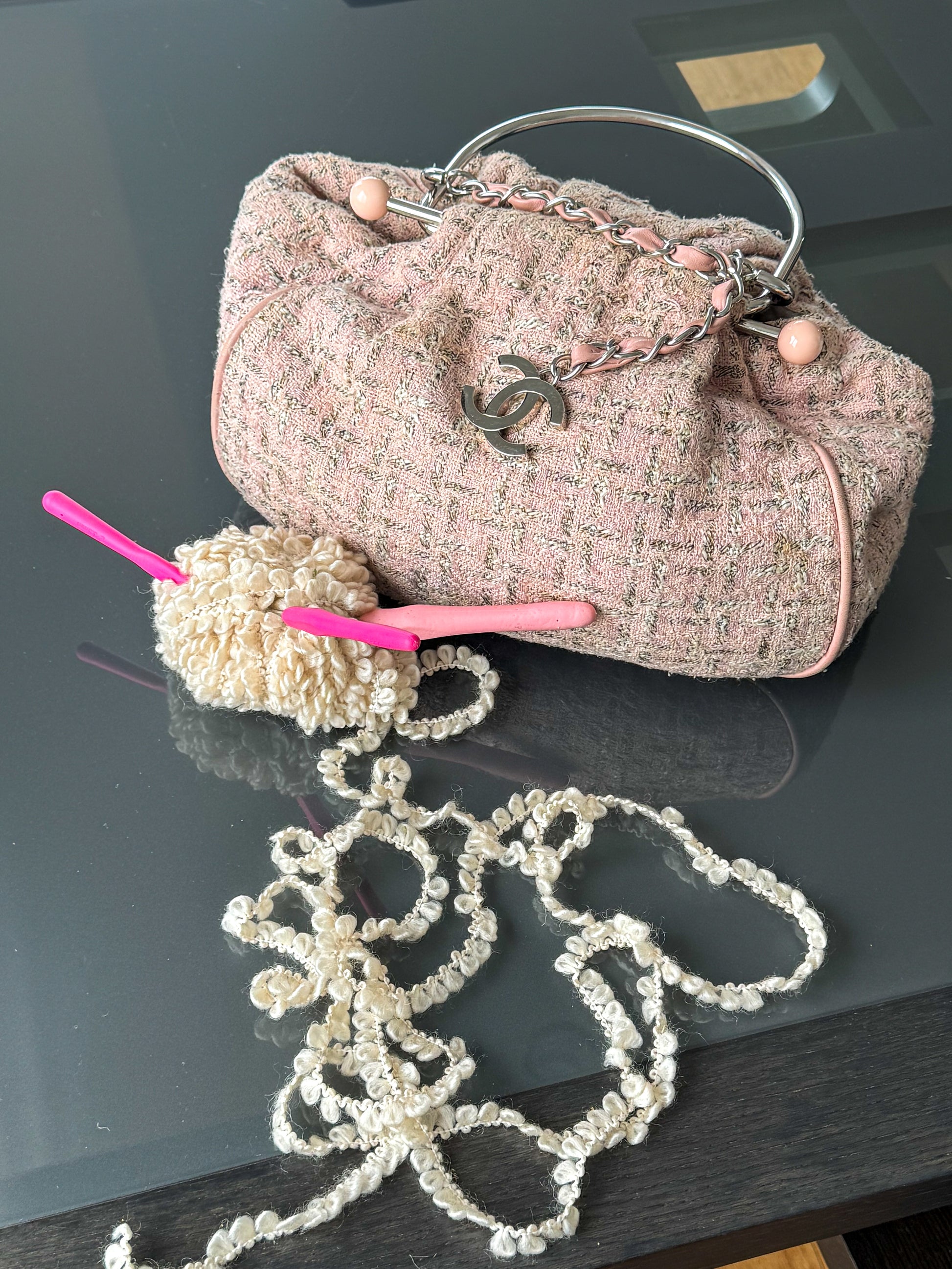 Designed in a signature pink tweed with interwoven metallic threads, it features a whimsical oversized metal knitting needle handle adorned with pink resin tips and Chanel logos, referencing traditional knitting needles.
