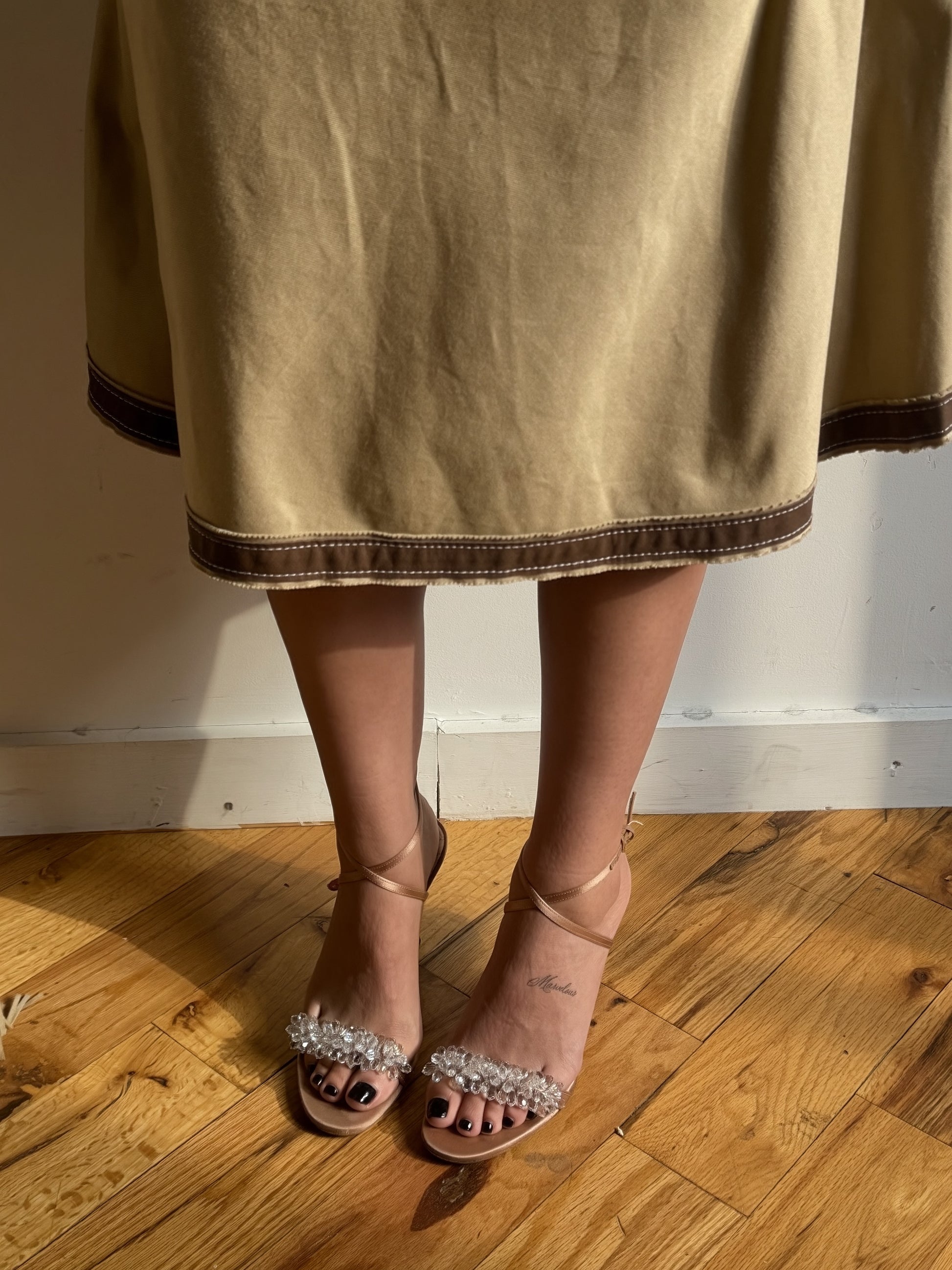 Iconic pair of vintage Gucci heels from the Tom Ford era, crafted in a soft champagne-toned silk with quilted insoles for comfort and subtle luxury.