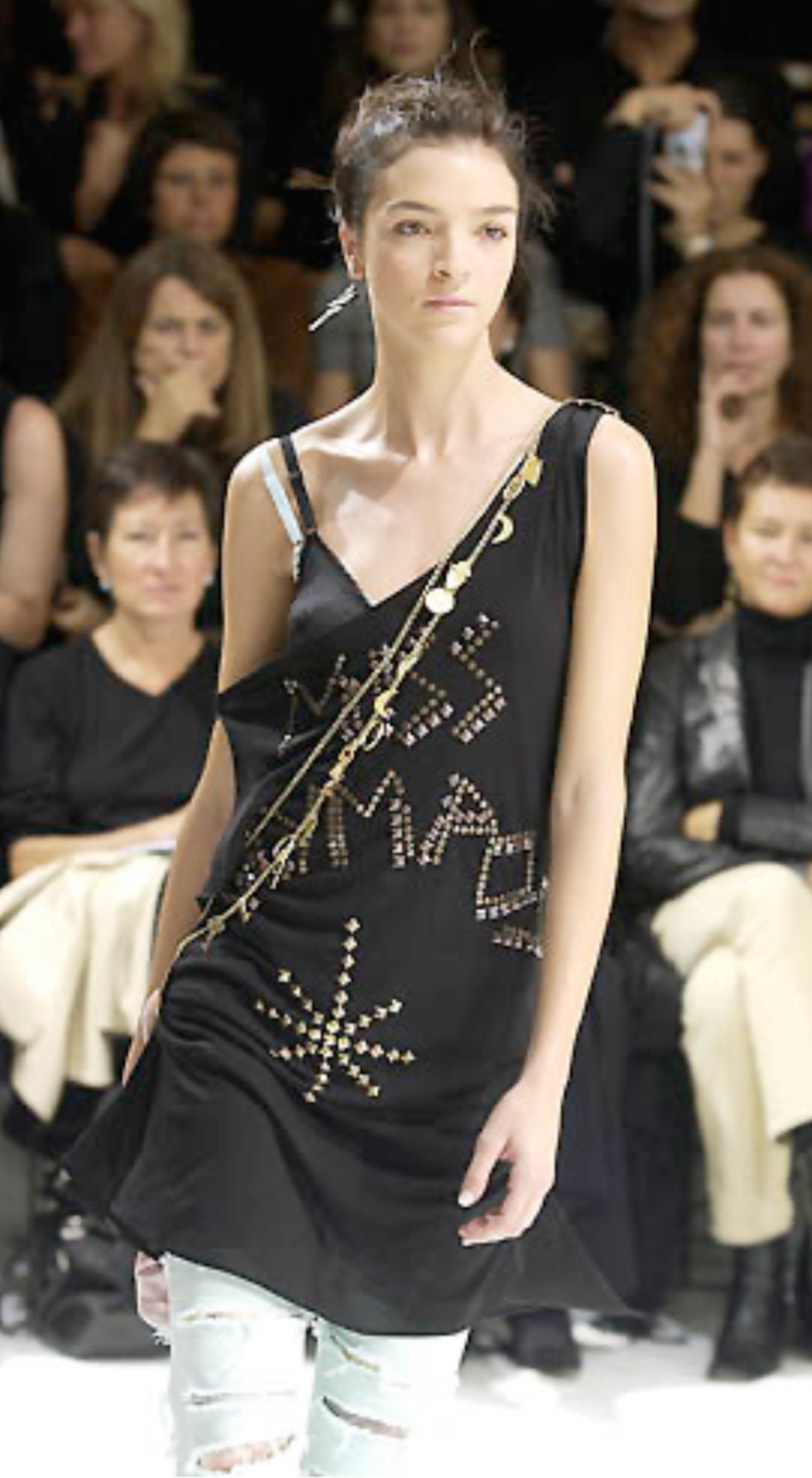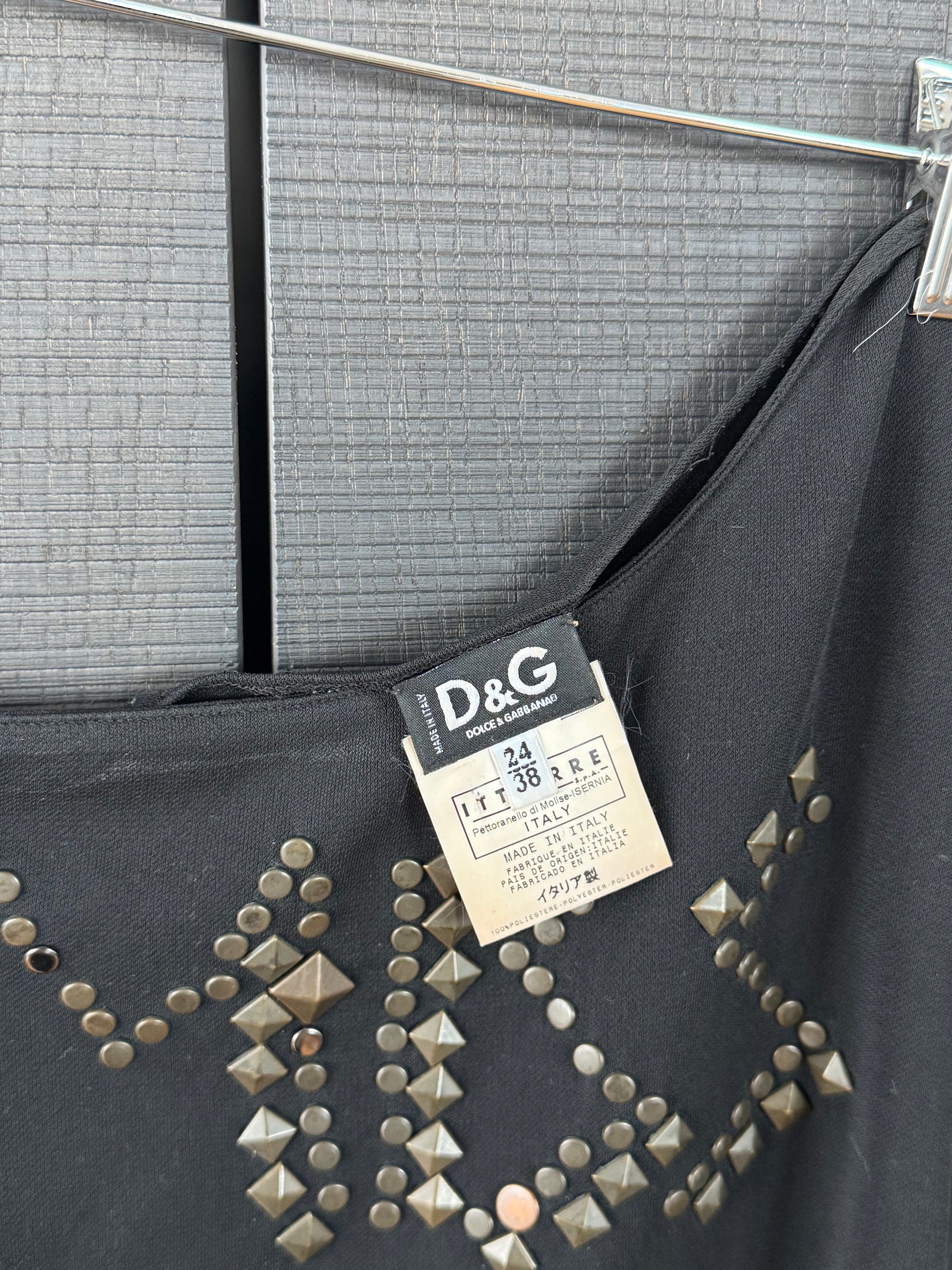 A rare and iconic Dolce & Gabbana runway piece from the Spring/Summer 2003 collection, this asymmetric draped dress/top features intricate gold studded motifs spelling out "MISS OLYMPOS” across a fluid black silk base.