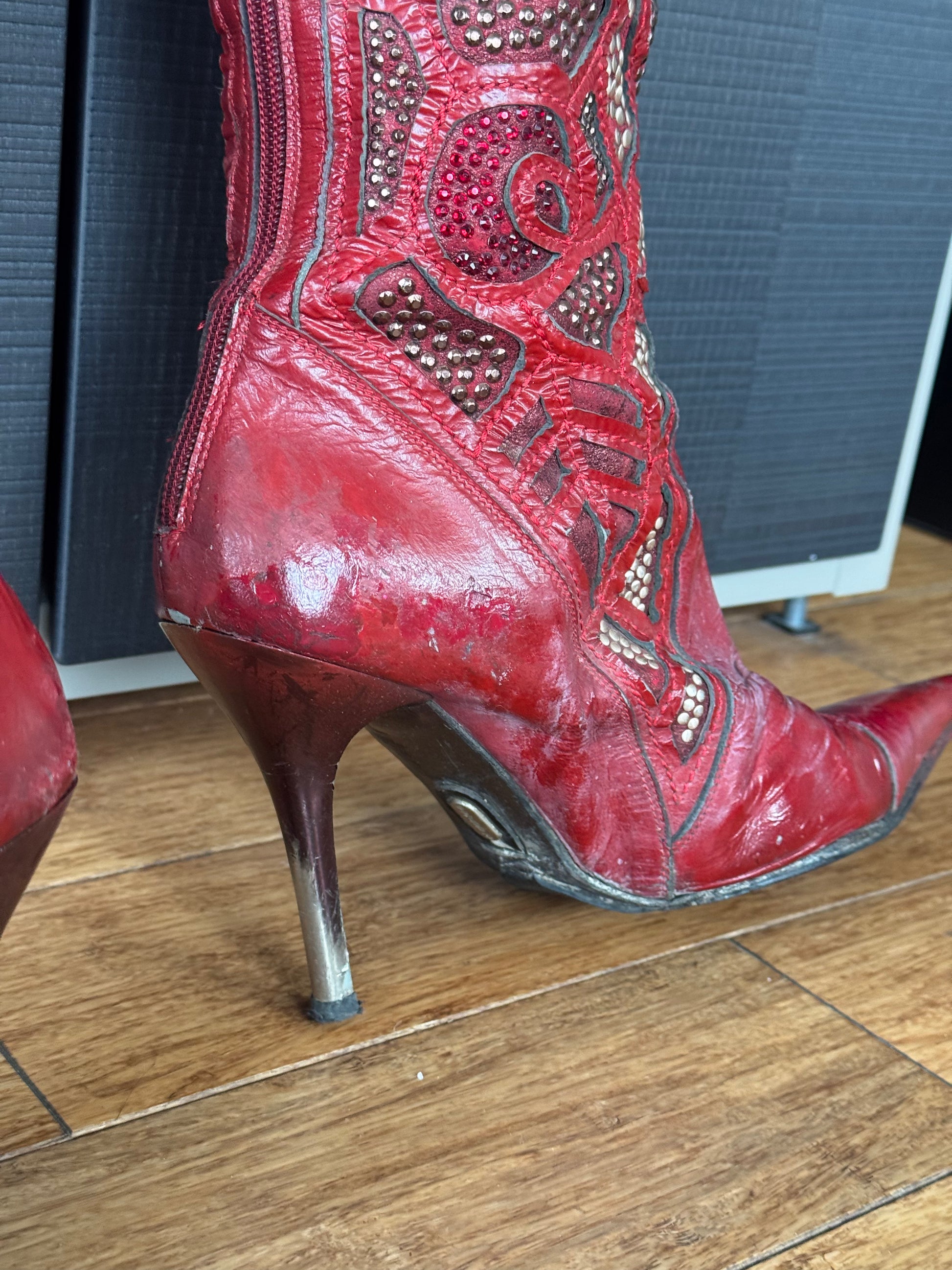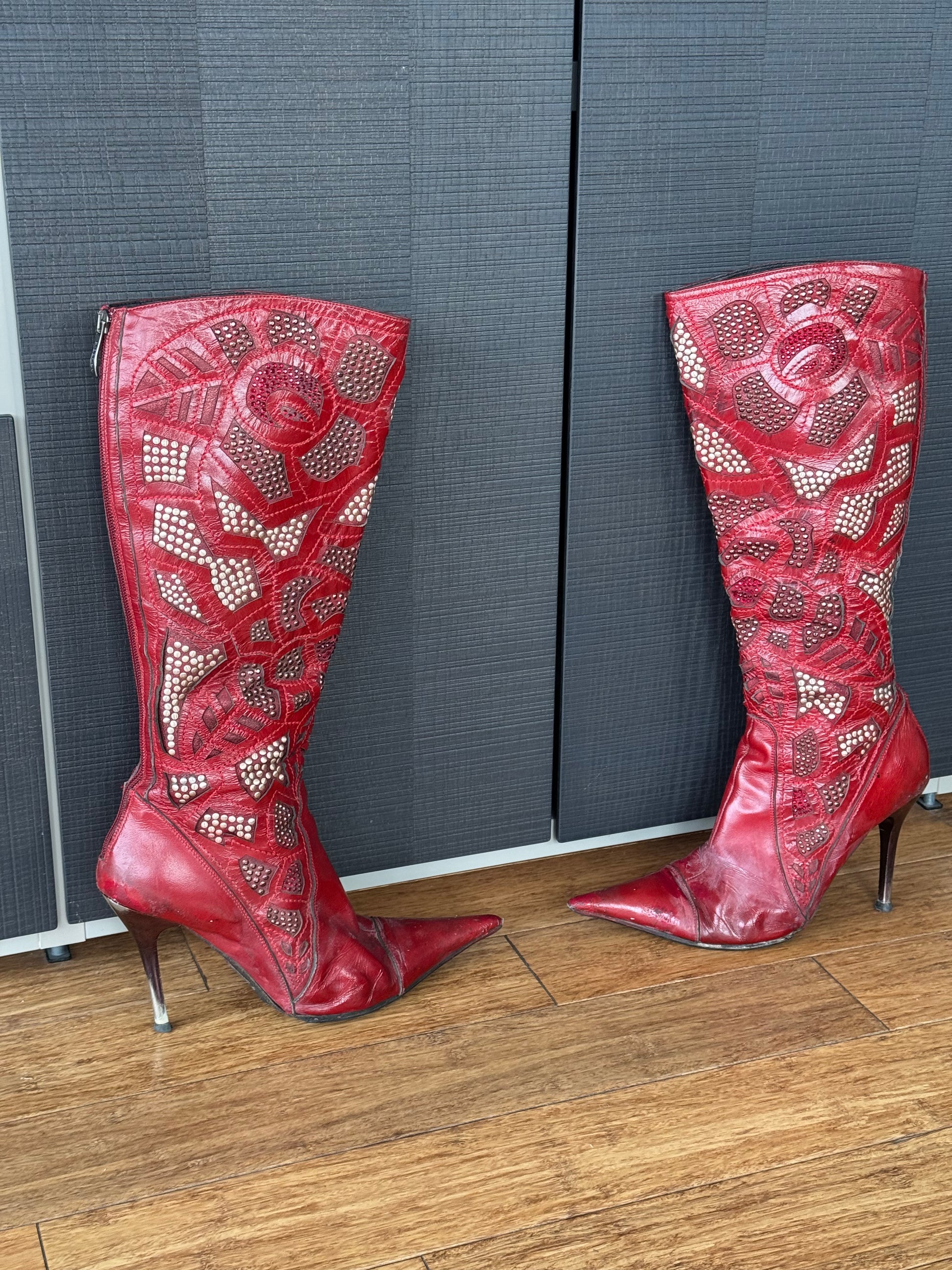 Rare 2000s El Dantes knee high boots in a rich oxblood red leather, featuring their signature abstract cut-out pattern and allover crystal stud detailing.