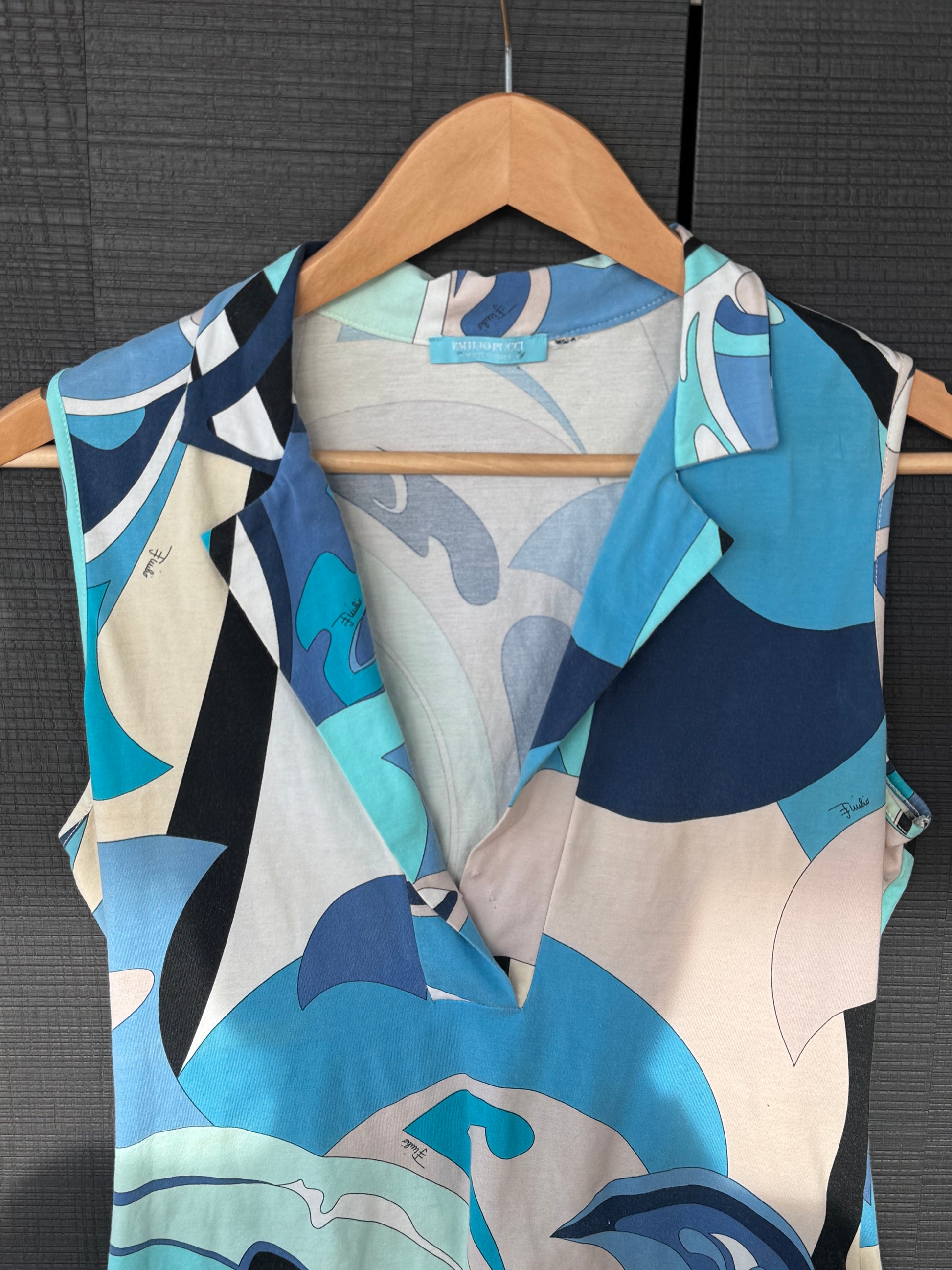 Emilio Pucci V-neck stretch cotton top featuring the house’s iconic abstract swirl print in layered shades of blue, aqua, cream, and black.
