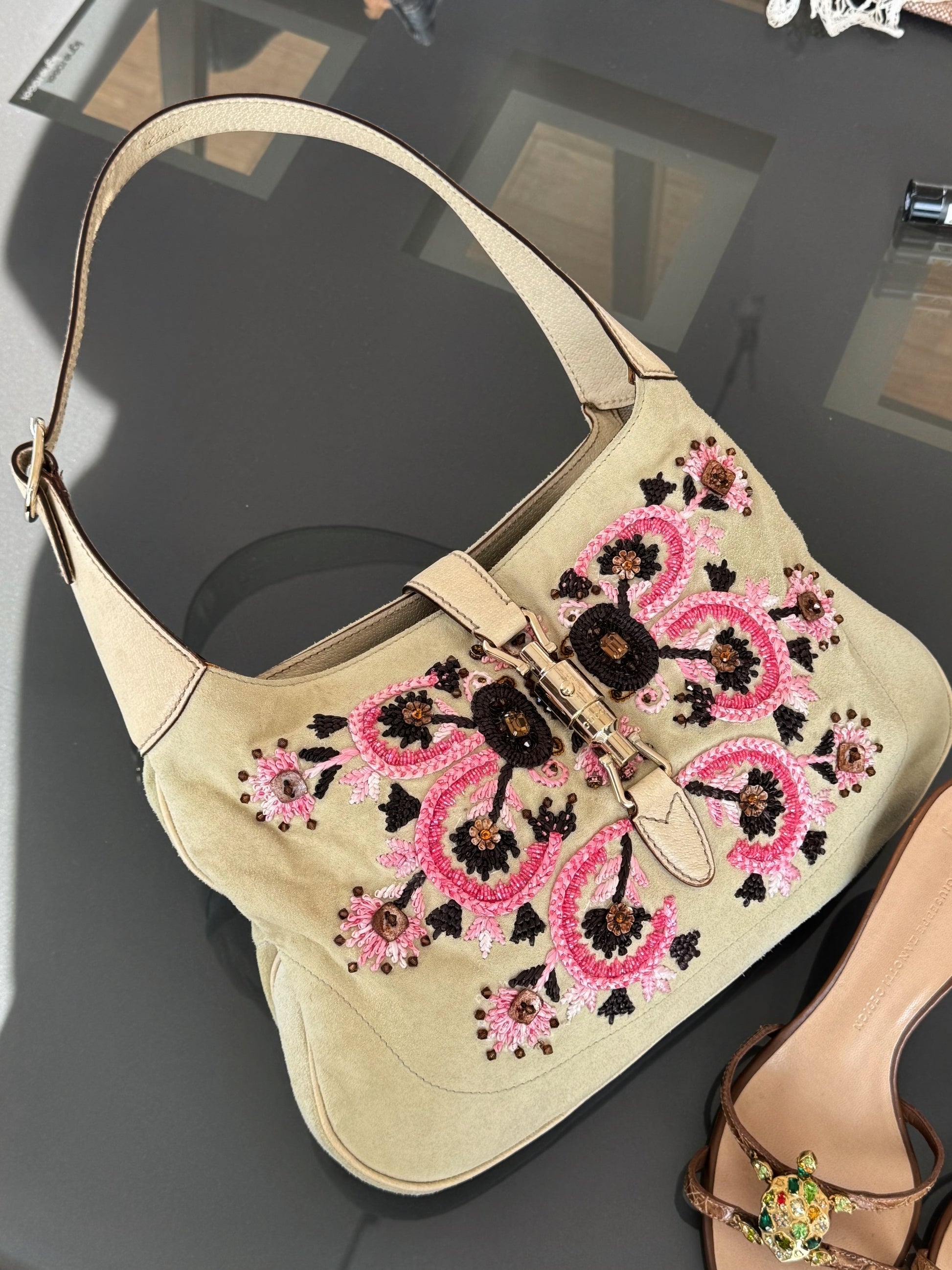 Rare Gucci Jackie bag crafted in soft beige suede with intricate hand-beaded floral embroidery in pink, brown, and black.