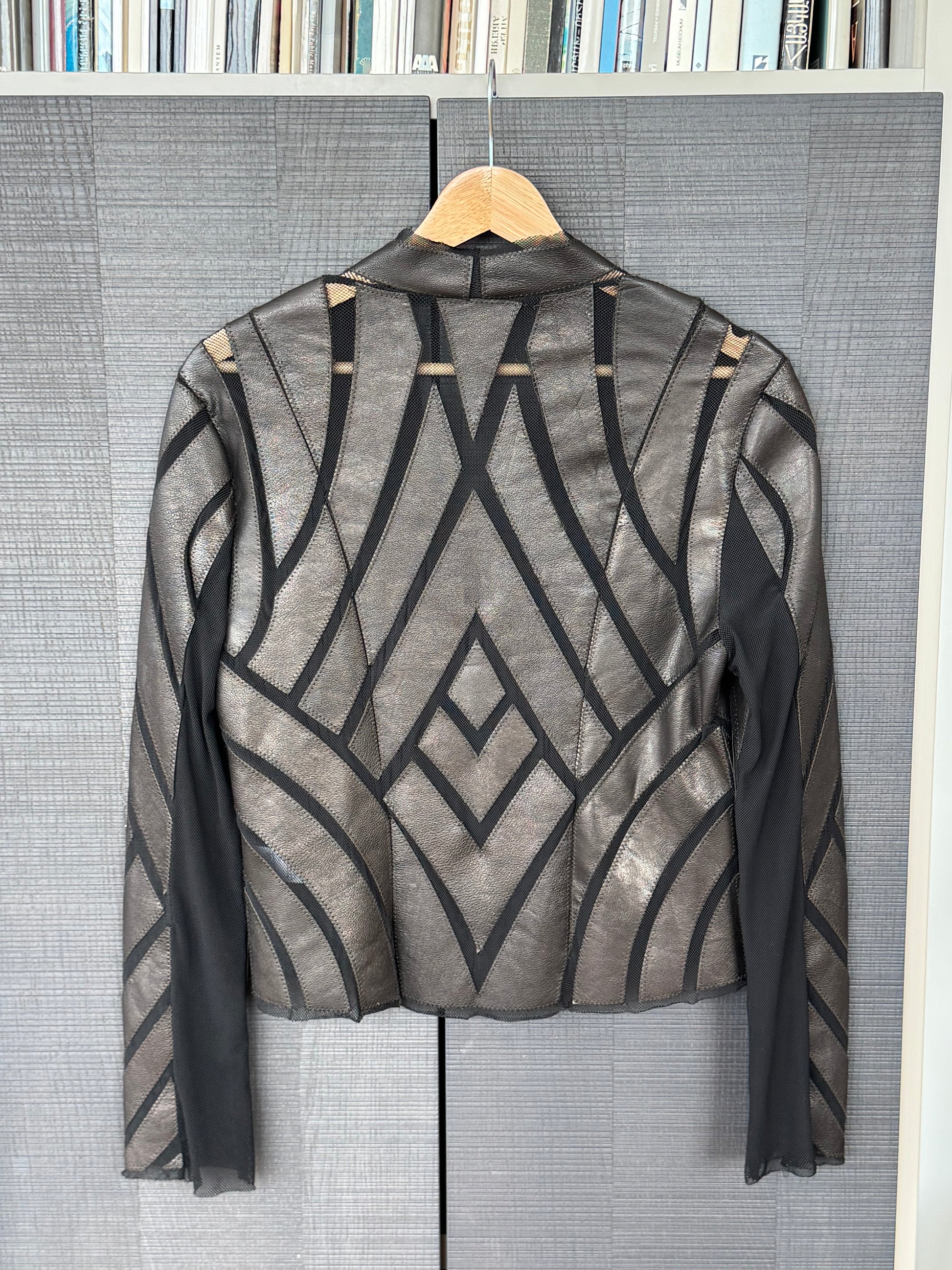 Edgy Haute Hippie genuine leather and mesh jacket featuring a bold geometric cutout design.