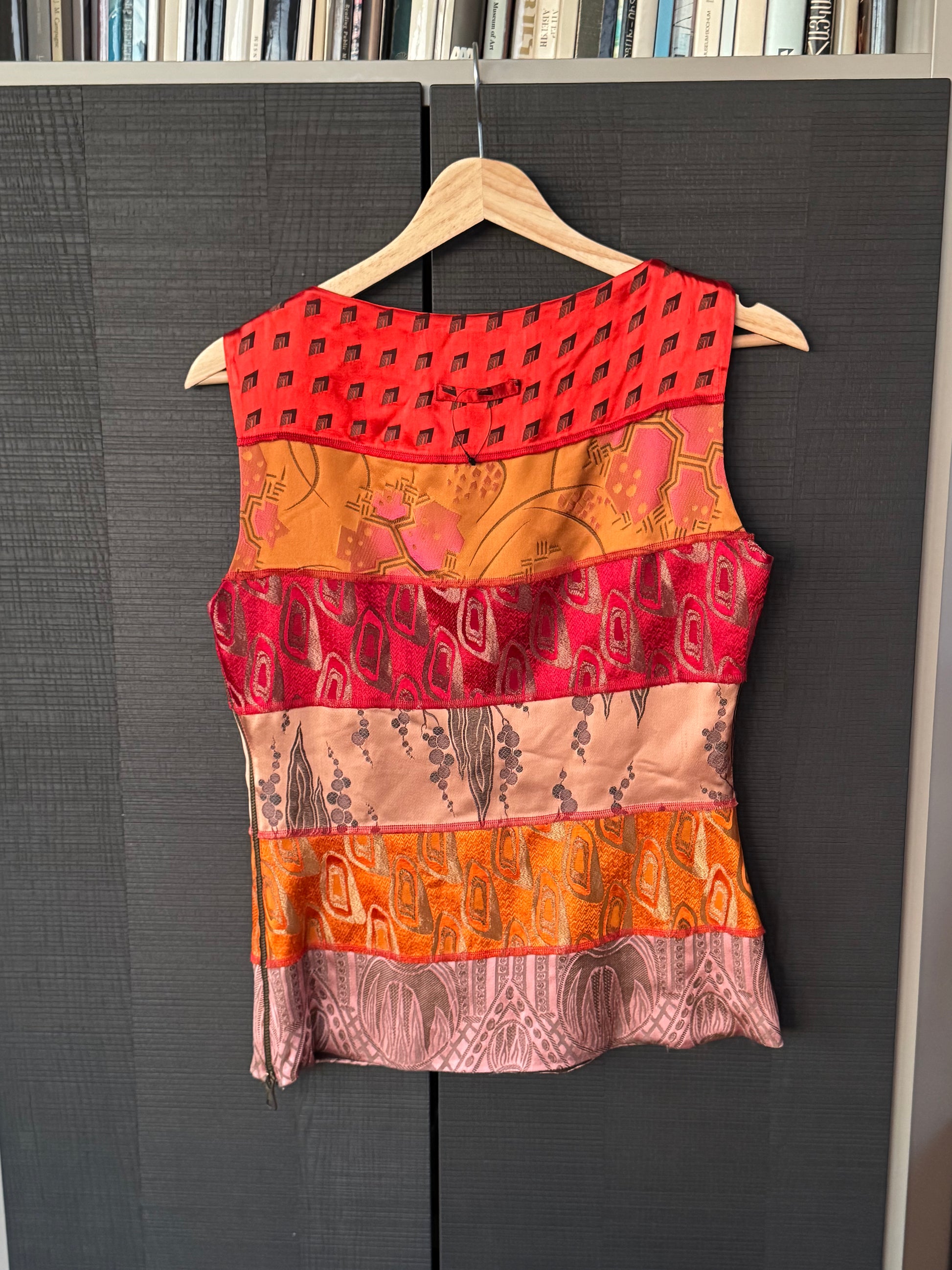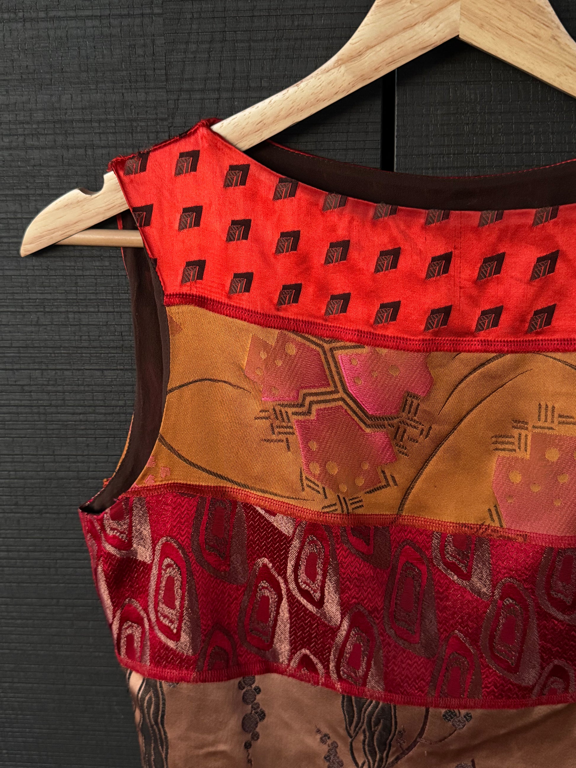 Details: Sleeveless cut, paneled construction, mixed brocade and patterned fabrics, sculpted fit