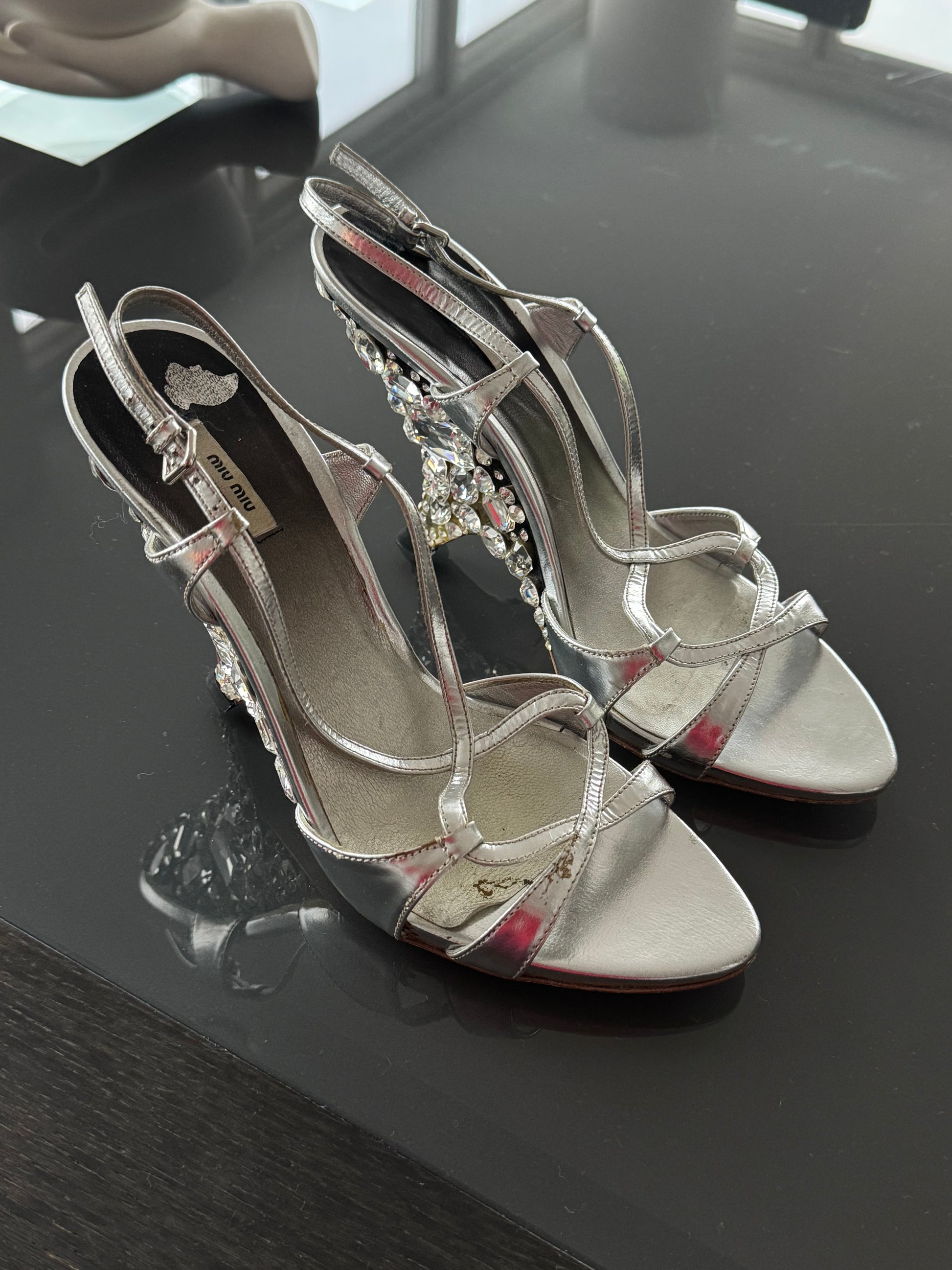 A dazzling pair of Miu Miu silver leather heels featuring delicate strappy uppers and sculptural heels fully embellished with faceted crystals. The light catches every movement, giving a true red-carpet sparkle while keeping the silhouette sleek and feminine.