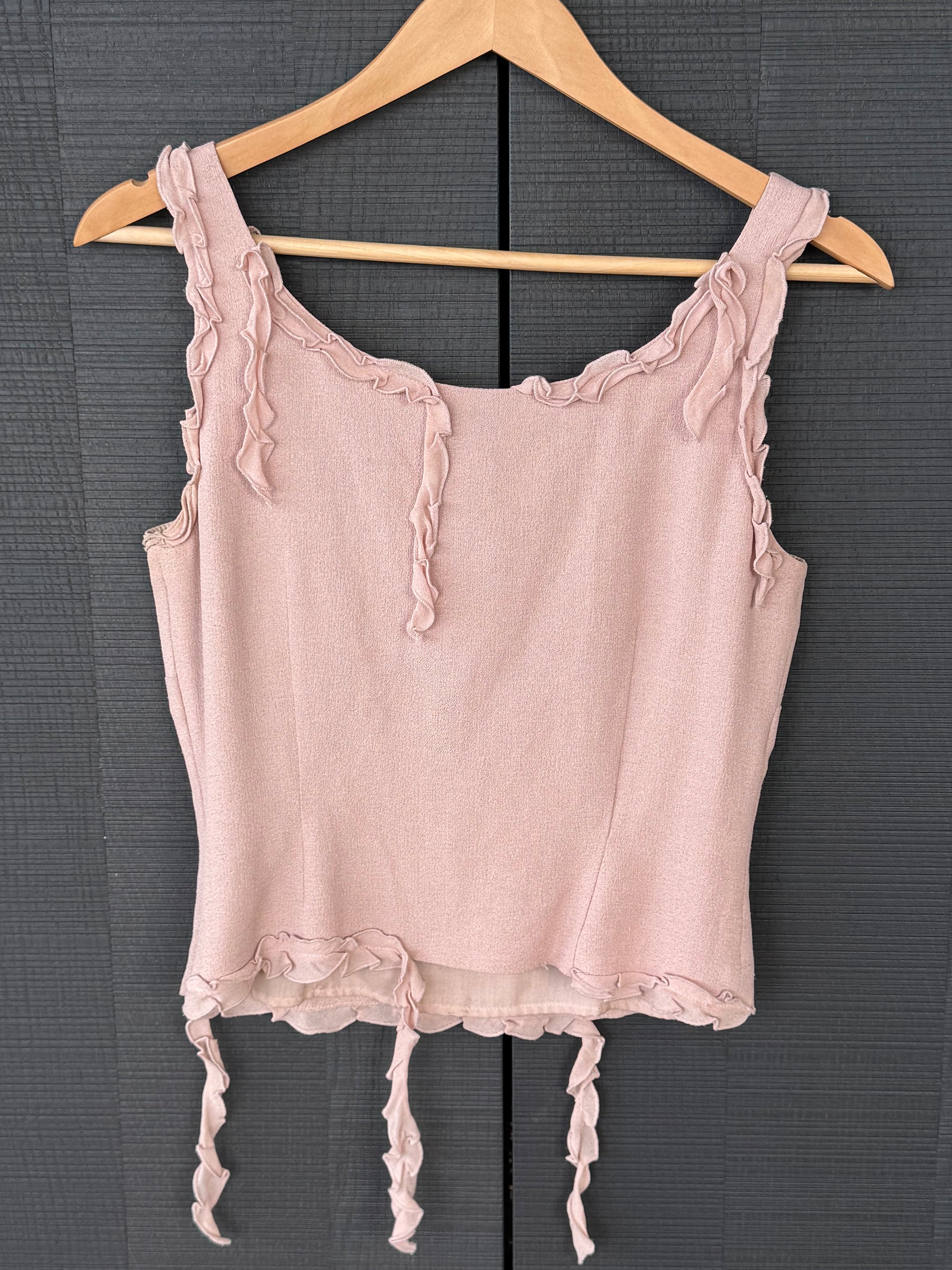 Vintage Moschino Cheap and Chic tank featuring ruffled trim, a signature rose appliqué, and delicate cascading ties throughout.