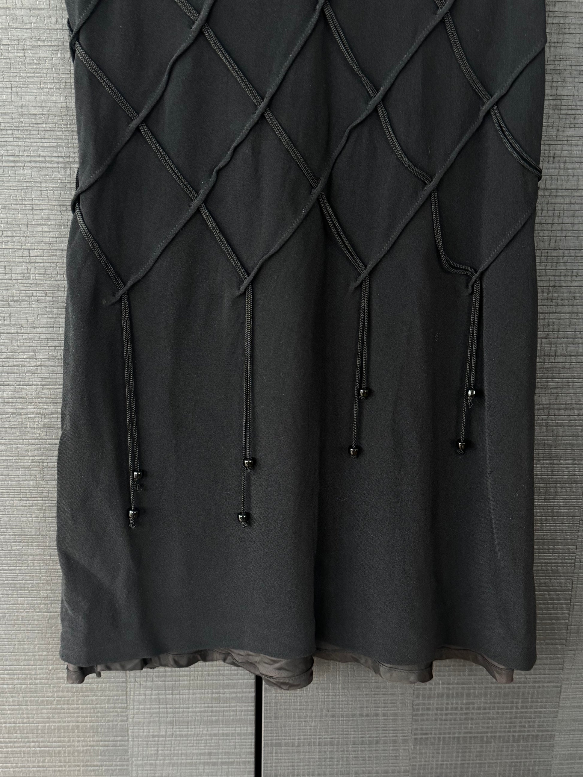 A rare and beautifully constructed Moschino Cheap & Chic mini featuring a full lattice overlay with long dangling ties finished in glossy black beads.