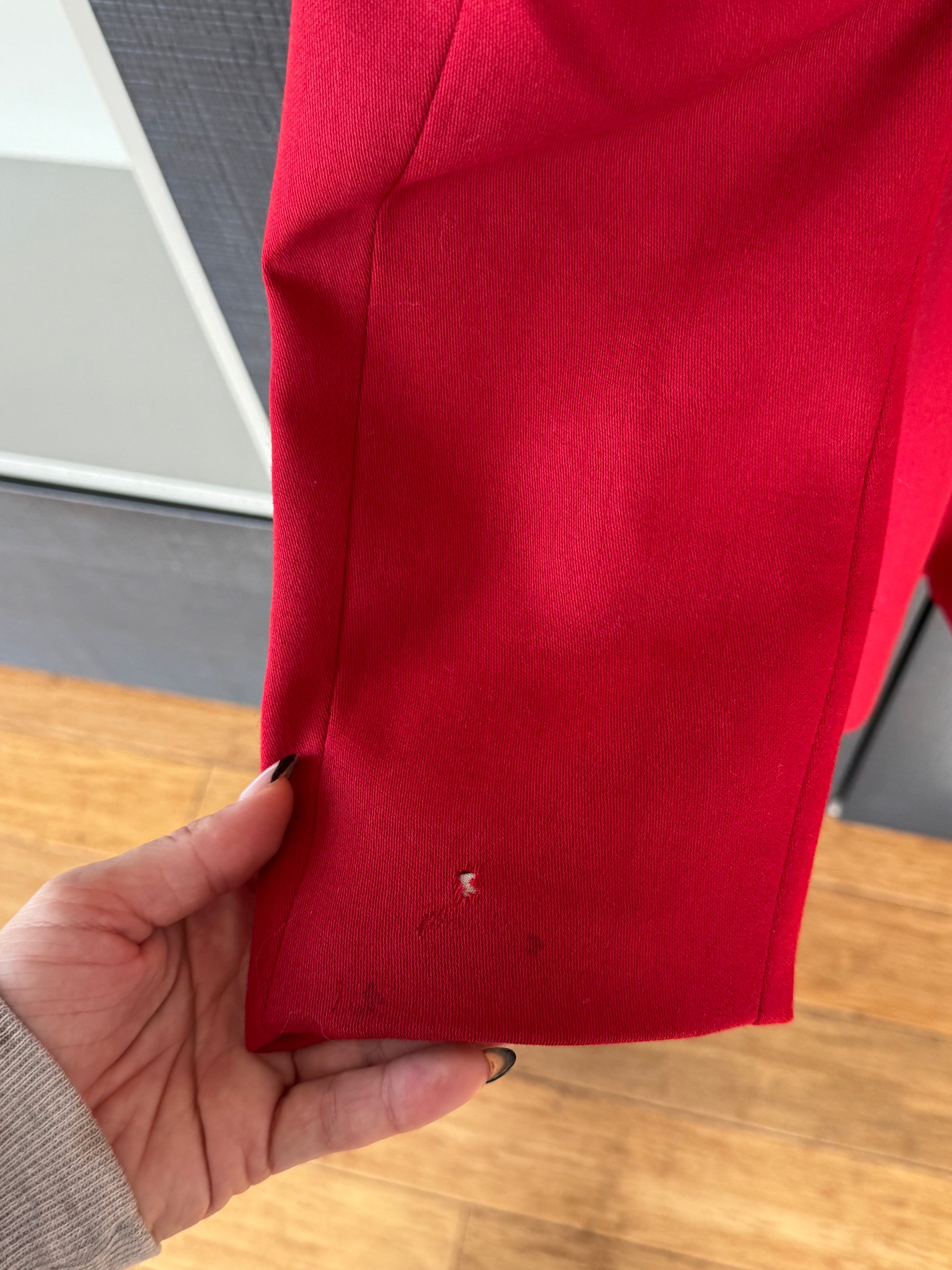 Crafted from rich red wool, this Moschino Cheap and Chic blazer features a black velvet shawl collar, matching velvet pocket details, and a charming mini bow accent at the neckline, a subtle nod to Moschino’s feminine wit.