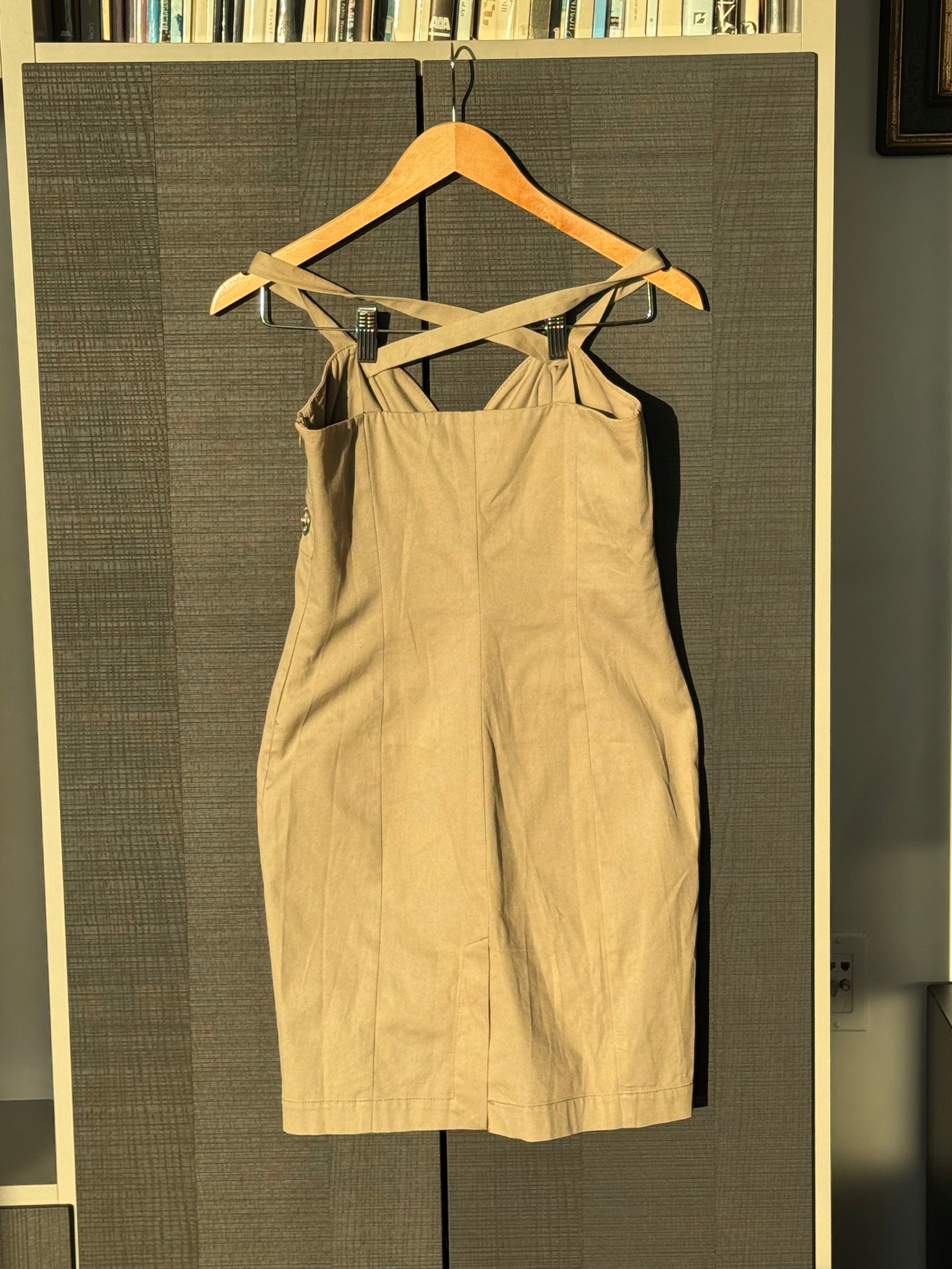 Vintage Moschino Jeans fitted mini dress in a neutral khaki/tan tone, accented with signature silver metal hardware across the bust.