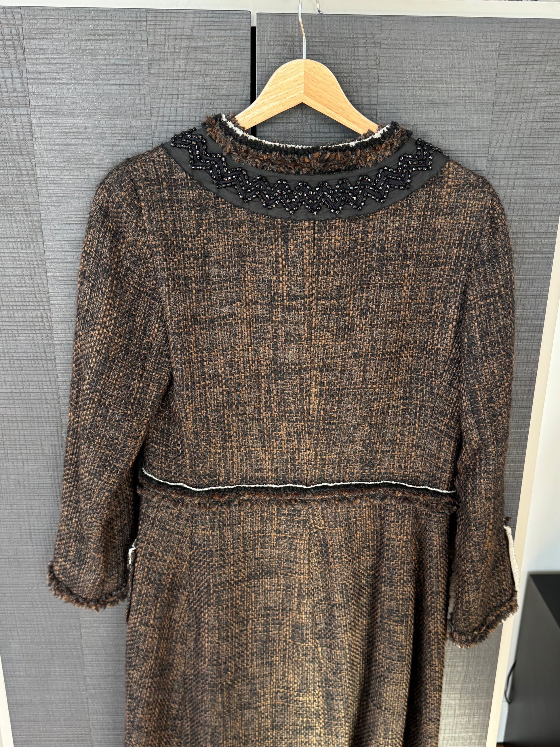 Crafted in a rich brown/black wool tweed, it features a hand-embroidered beaded collar set against black panels, trimmed with textural boucle and contrast ivory edging.