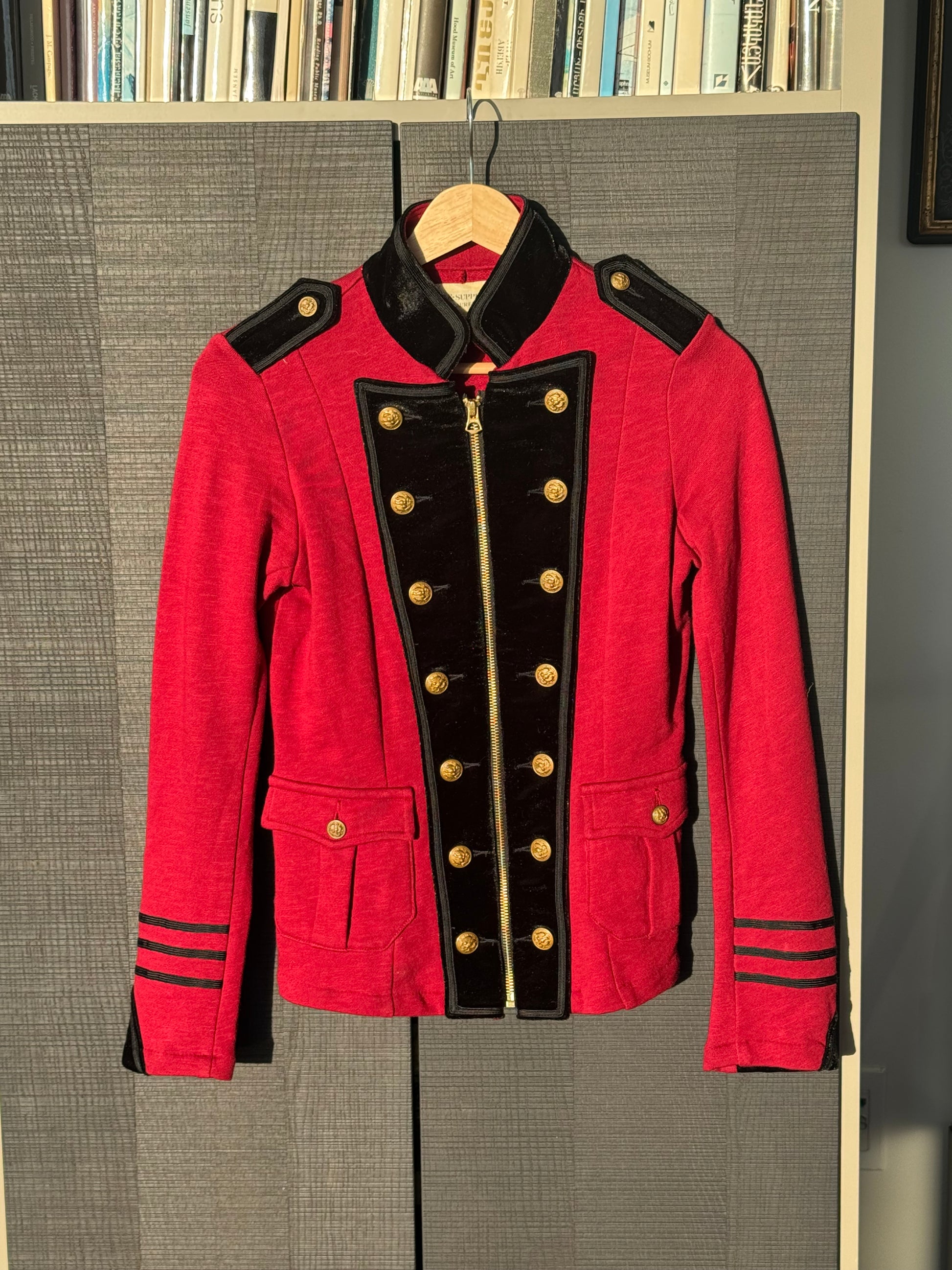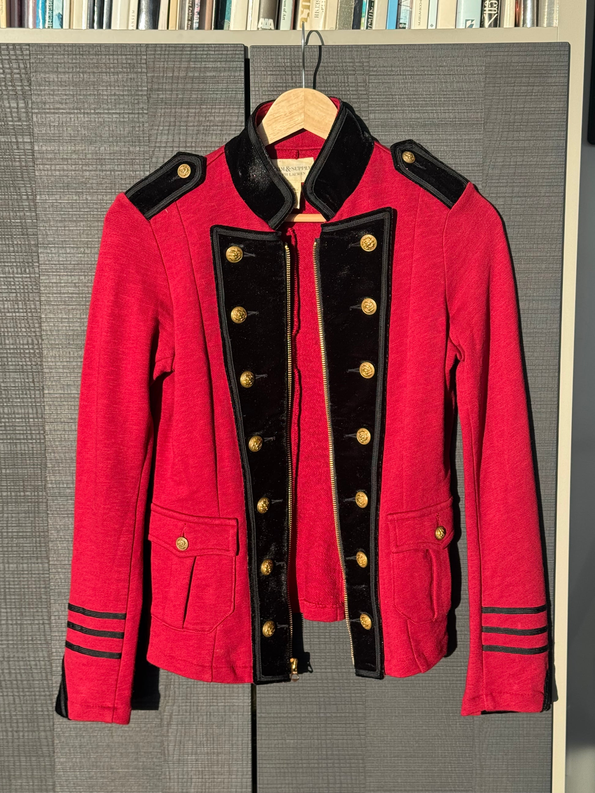 Ralph Lauren Denim & Supply military-inspired zip-up sweatshirt featuring rich red cotton with black velvet trim and gold-tone button detailing throughout.