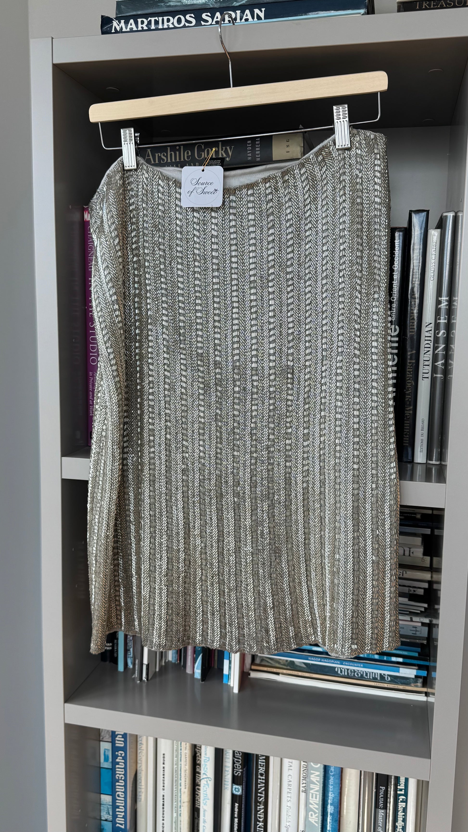 Elegant silk Ralph Lauren skirt featuring an allover beaded geometric pattern that catches the light beautifully with movement.
