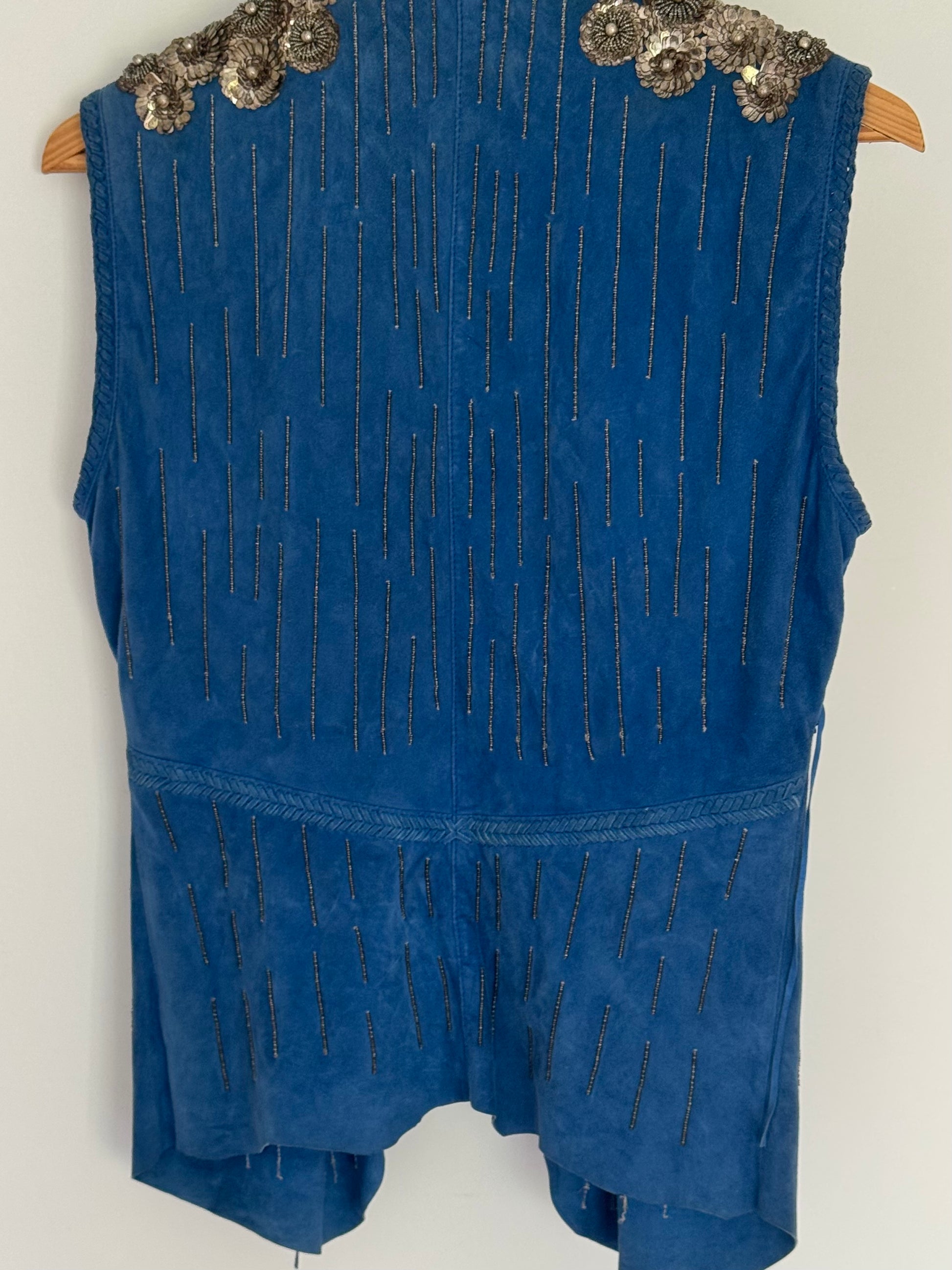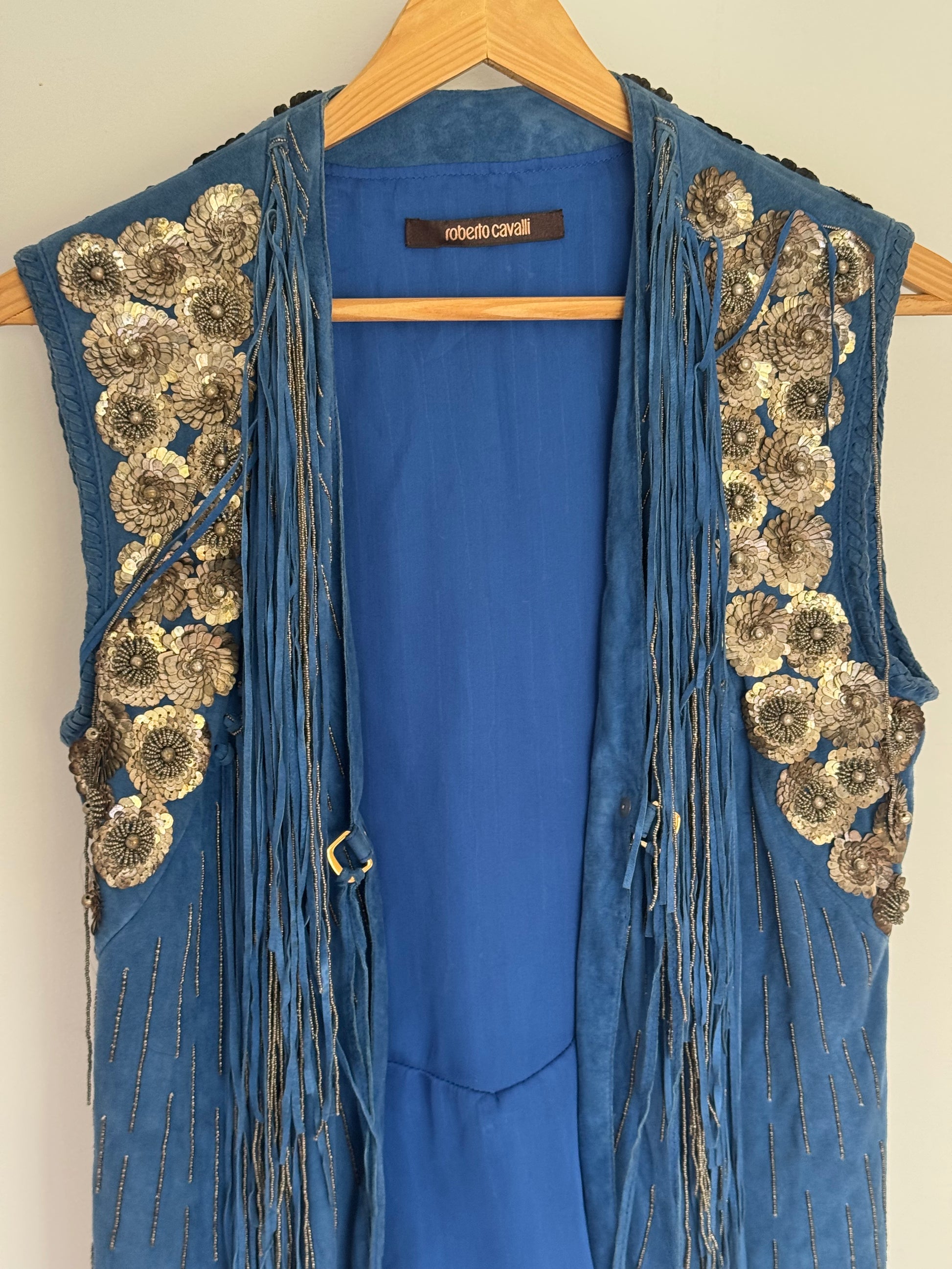 Roberto Cavalli Blue Suede Beaded Fringe Vest