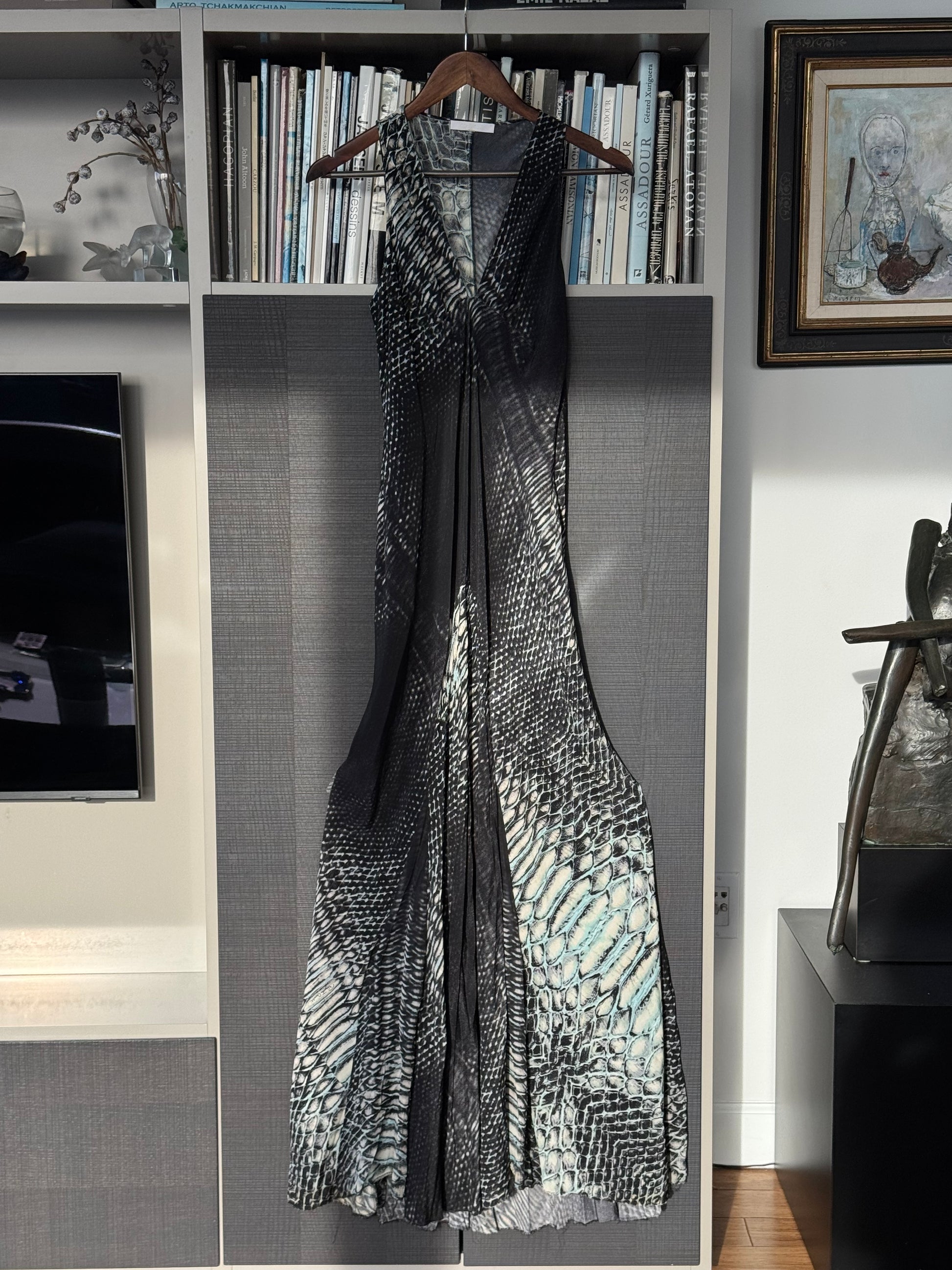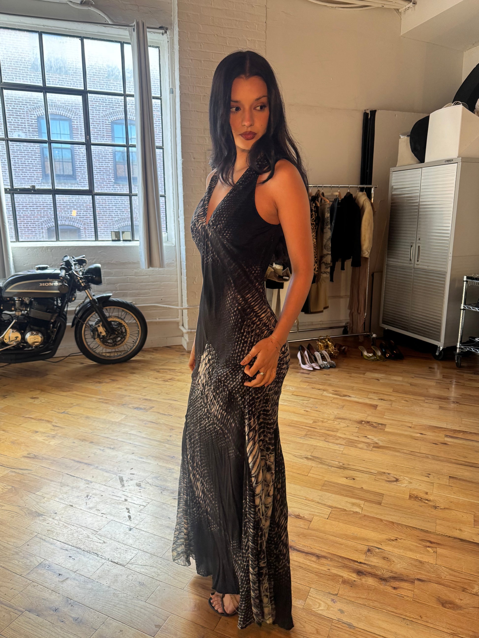 This vintage silk gown features a hypnotic snake print that melts into sheer, fluid panels toward the hem, creating a dramatic, slinky silhouette that moves beautifully on the body.