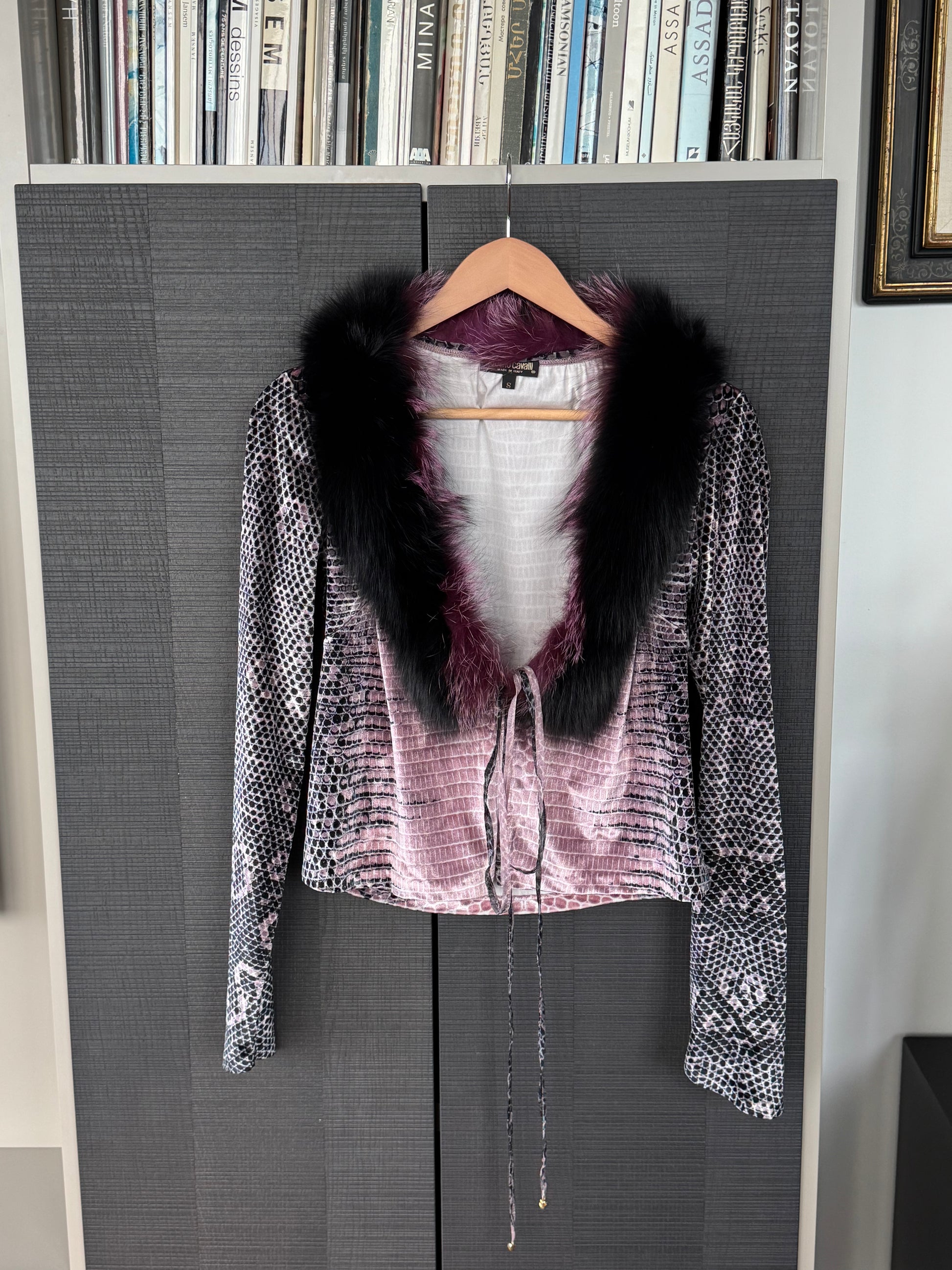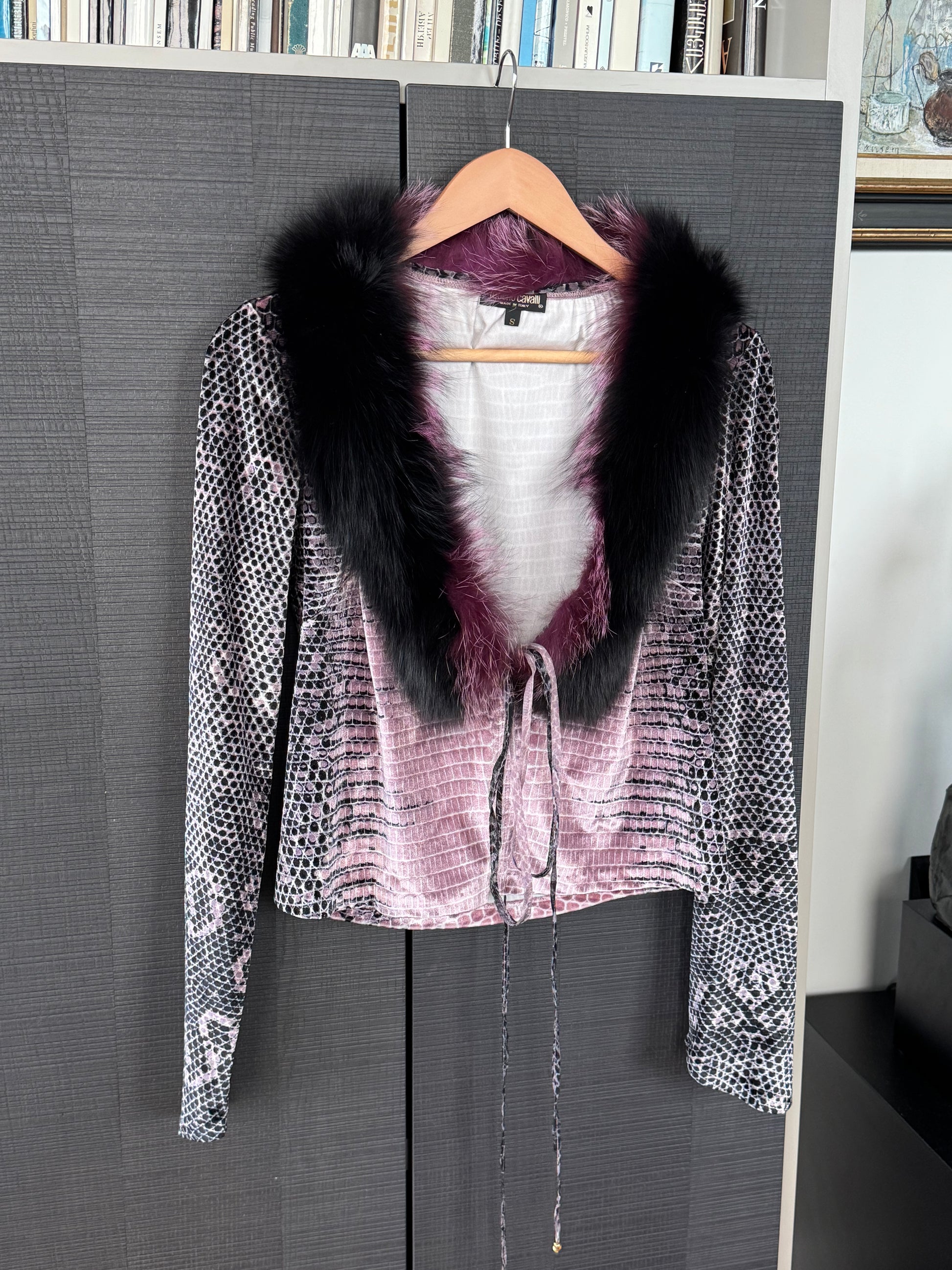 An exceptional rare Roberto Cavalli piece from the Fall/Winter 2000 collection: a velvet cardigan in Cavalli’s iconic reptile print, done in a gradient purple palette that catches the light beautifully.