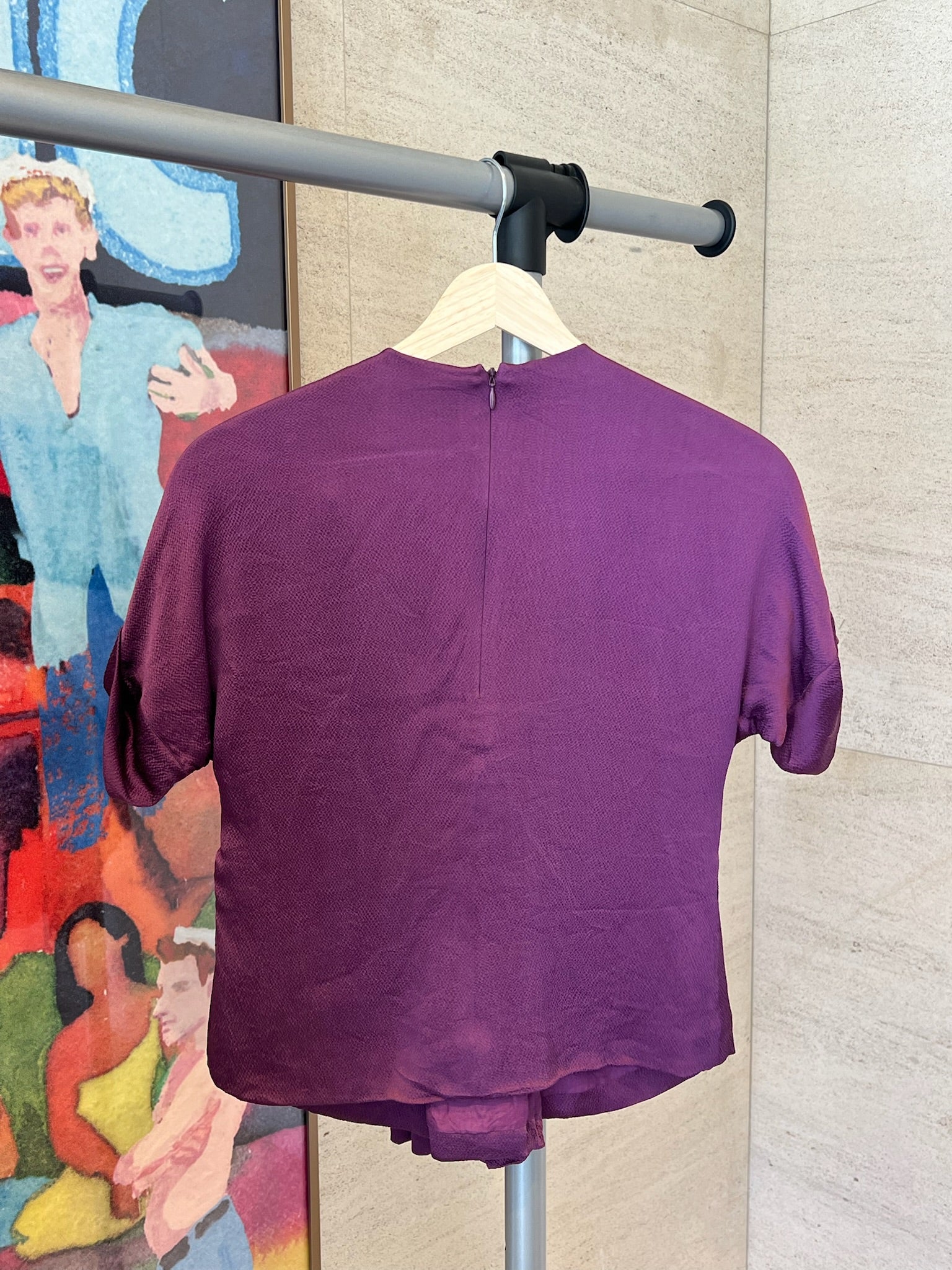 Crafted in a rich violet silk with a subtle sheen, the blouse features a sculptural knotted drape at the bodice that creates a fluid, cinched silhouette.