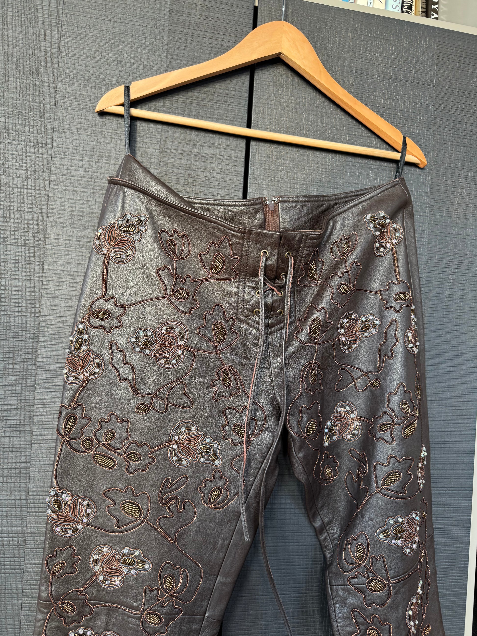 A show stopping pair of vintage Bebe leather pants crafted from supple brown leather and intricately embellished with tonal beading and embroidered floral motifs throughout the front.