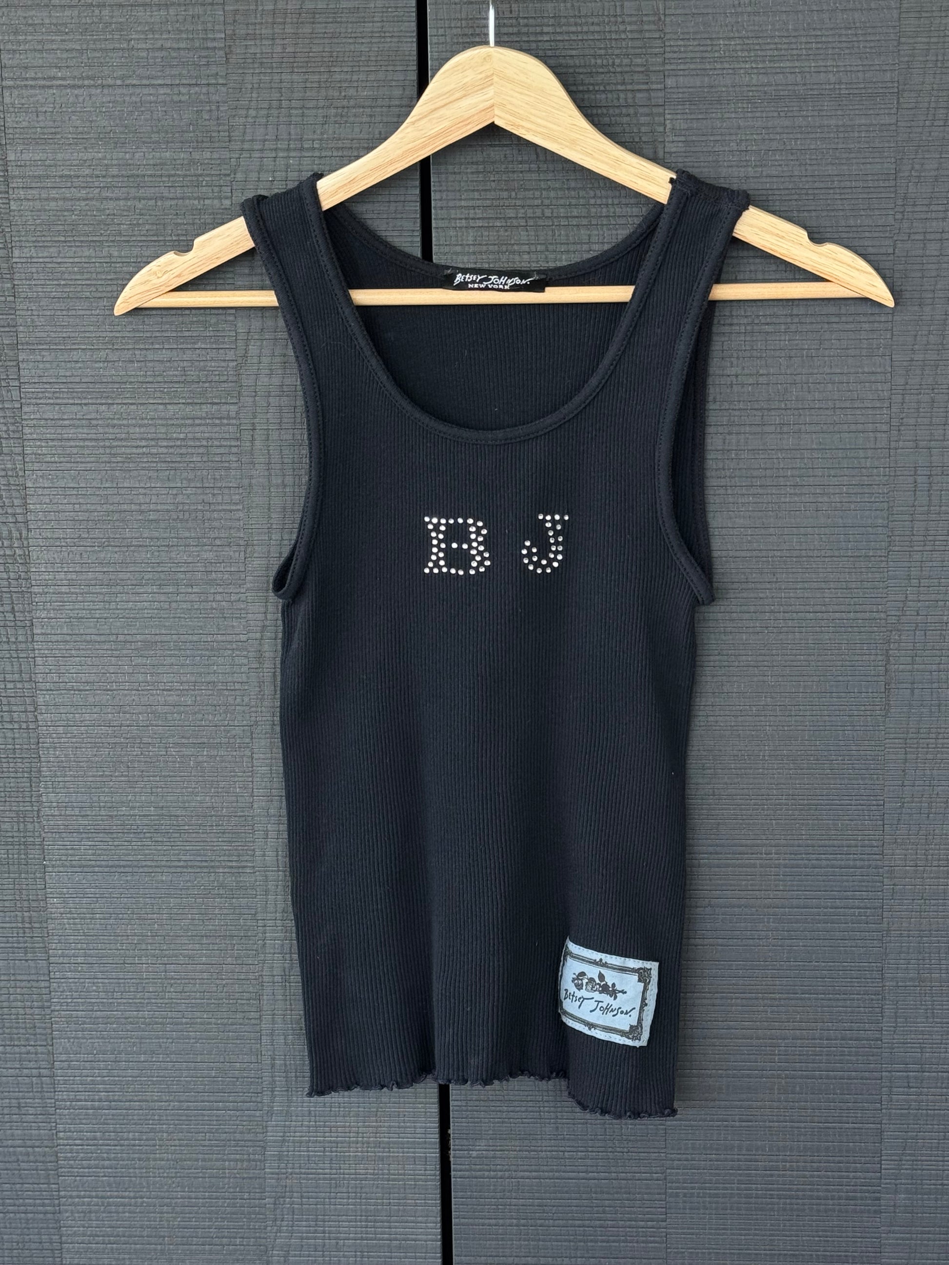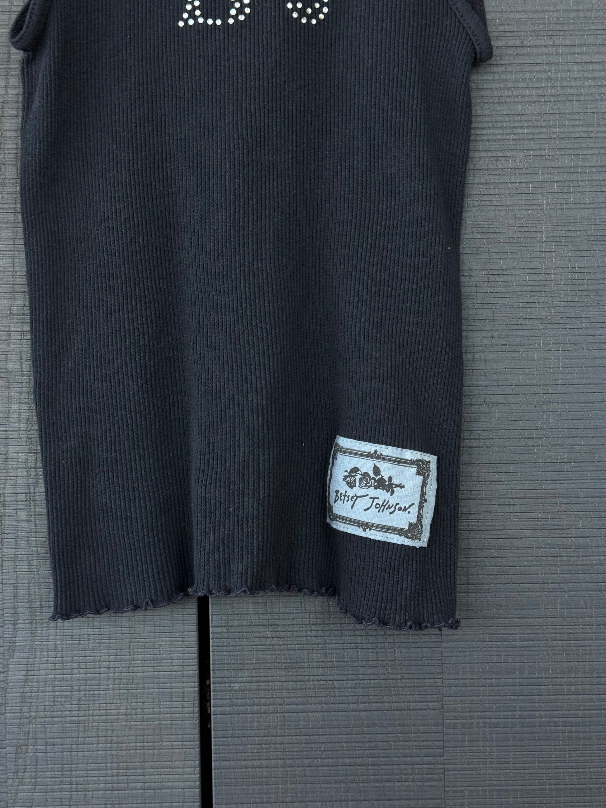 Iconic early Betsey Johnson ribbed tank featuring a sparkling rhinestone “BJ” motif across the chest. A perfect Y2K staple with that playful-meets-sexy Betsey energy, easy to style solo or layered.