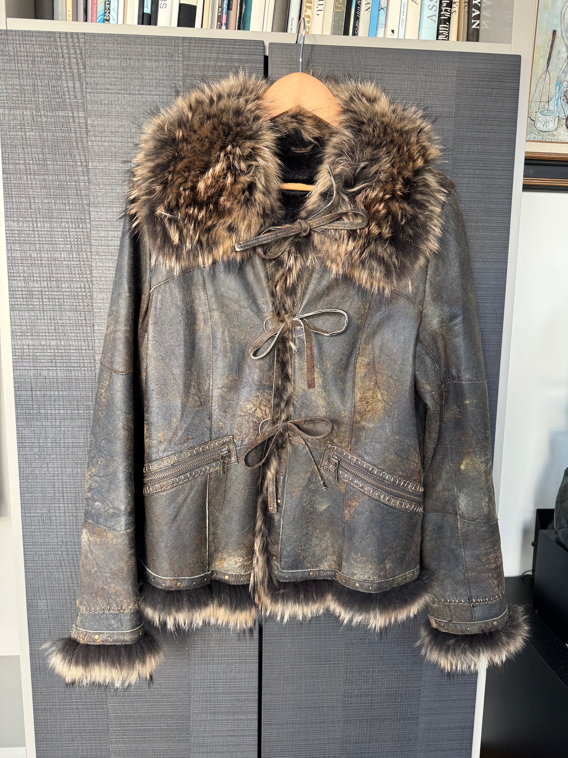 Designed with a rich, naturally distressed patina, this piece features an oversized, glamorous fur collar, fur-trimmed cuffs and hem, and delicate leather bow closures down the front for a romantic feel.