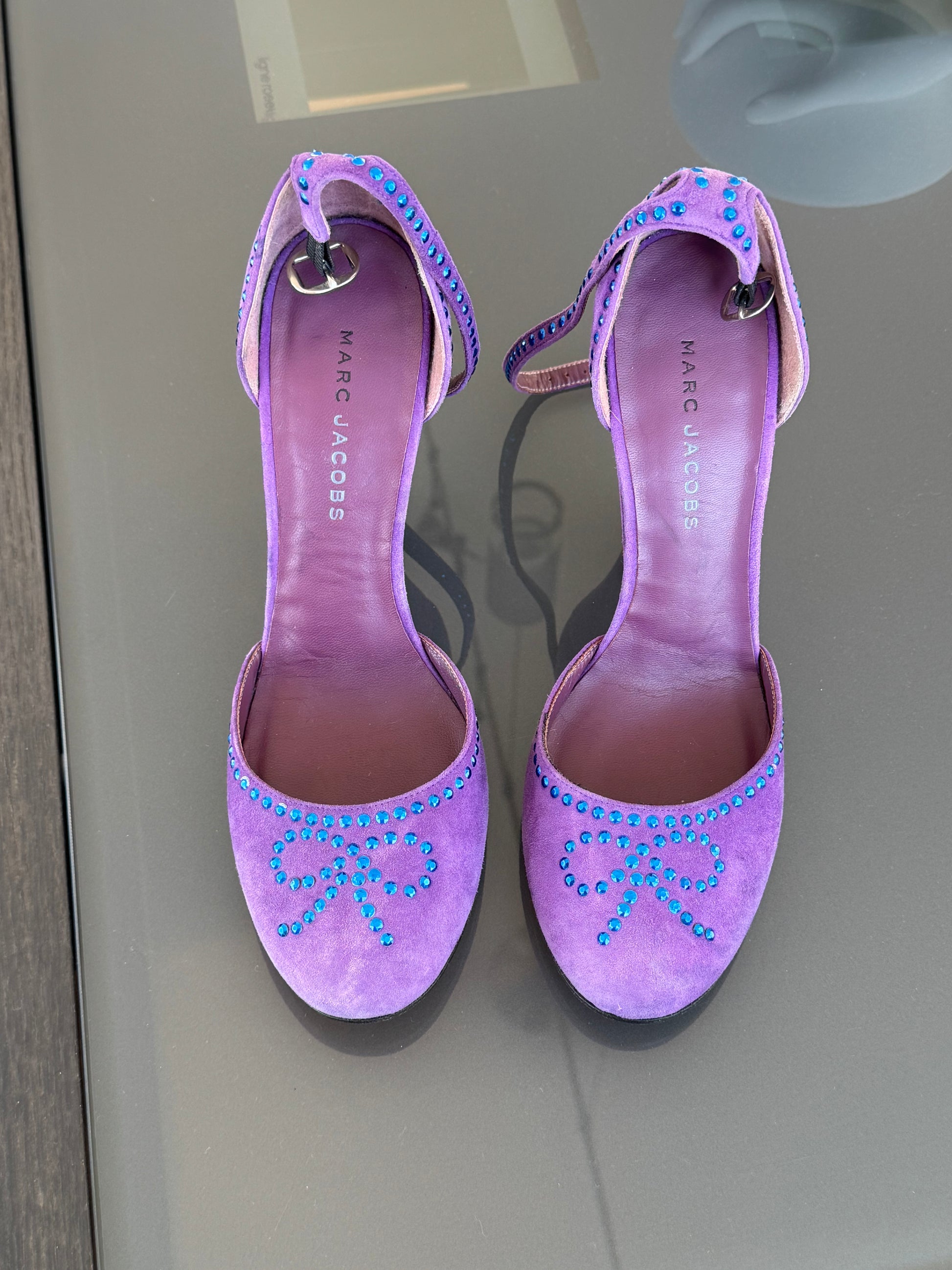A striking vintage heel from Marc Jacobs. Crafted in purple suede and finished with delicate blue stud embellishments forming a subtle bow motif, they feel equal parts whimsical and sophisticated.