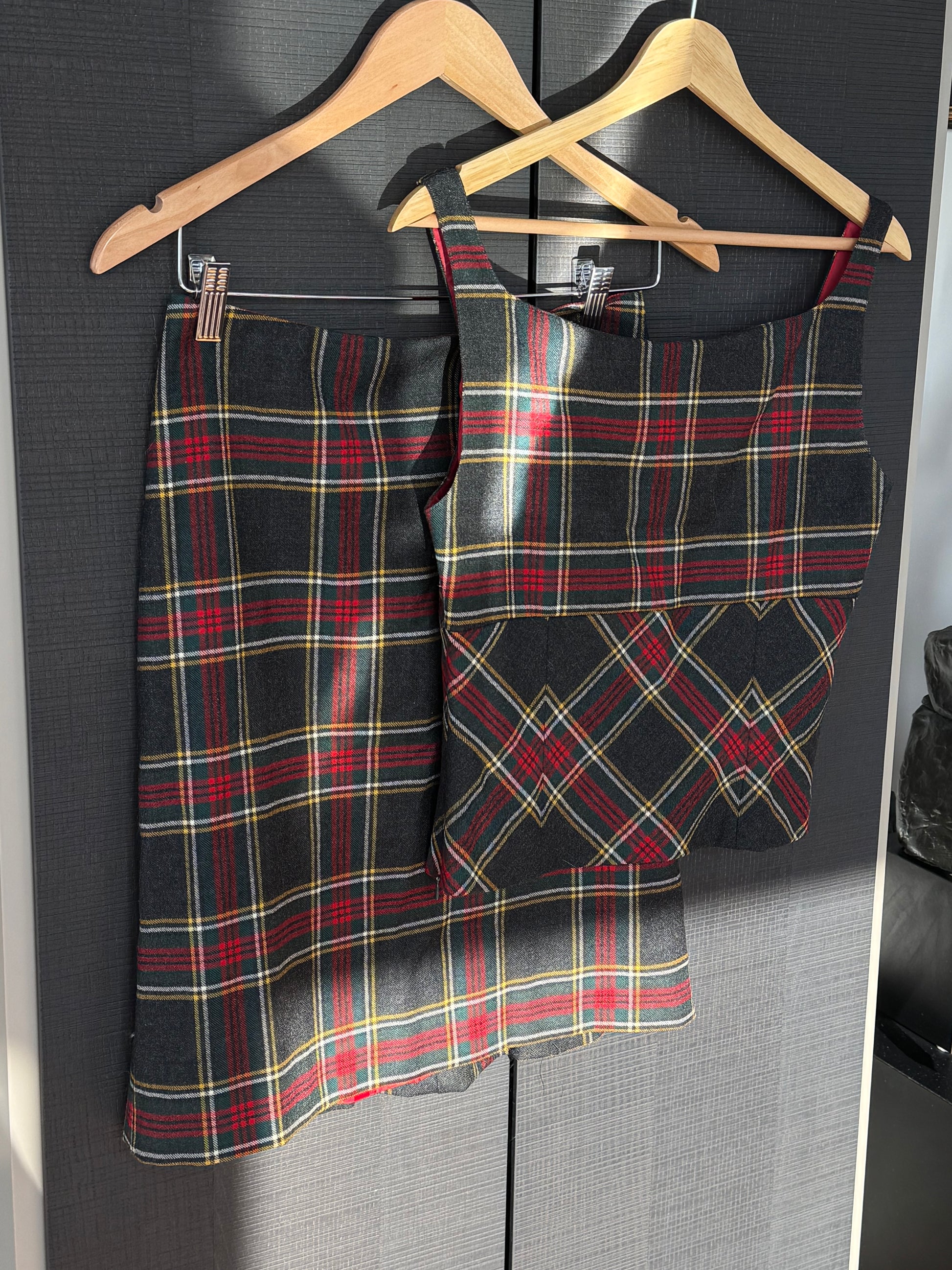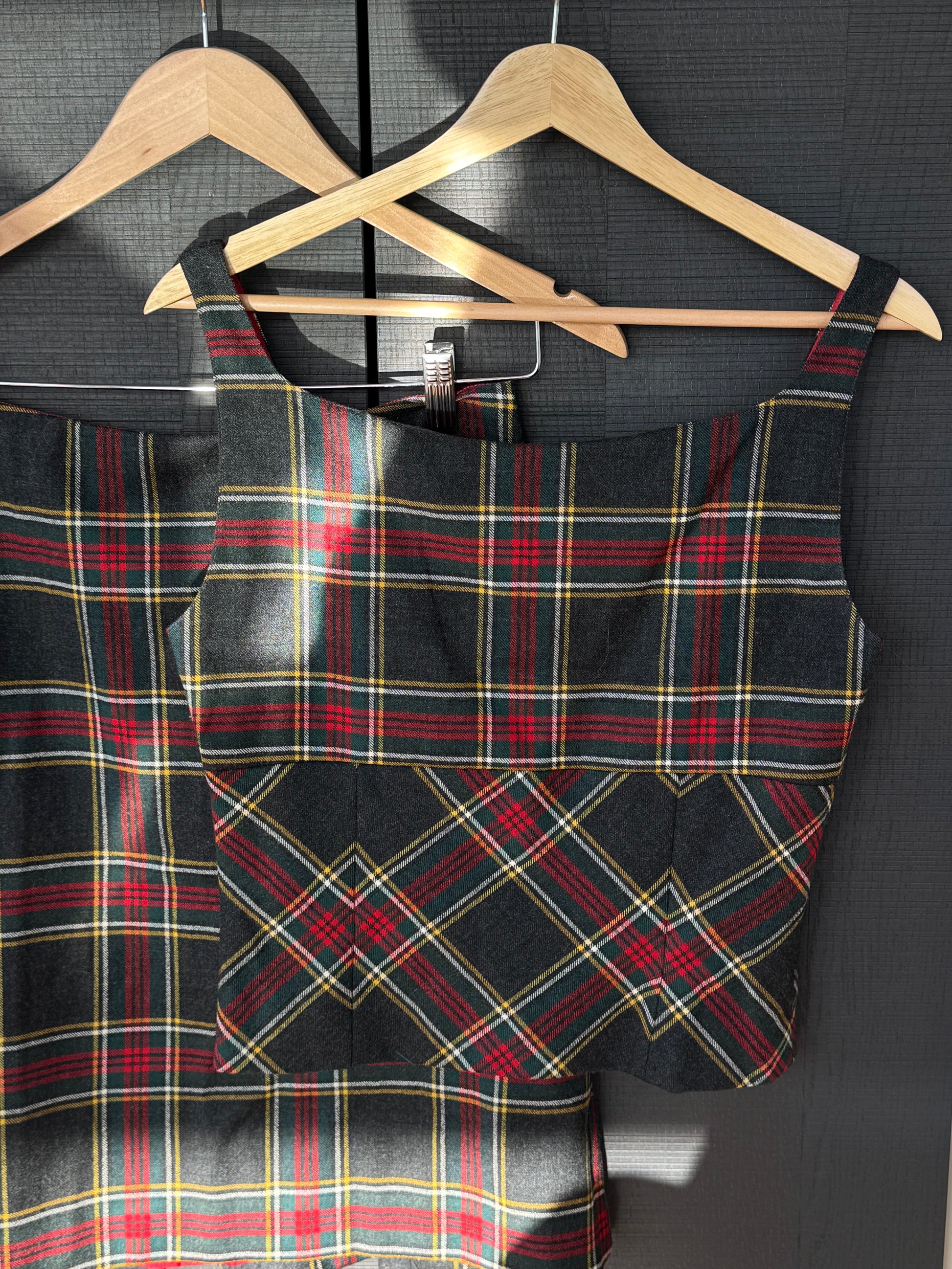 Crafted from structured wool in a timeless tartan plaid, this two-piece moment features a beautifully tailored skirt paired with a cropped tank-style top adorned with intricate beading and embroidered florals across the bust.