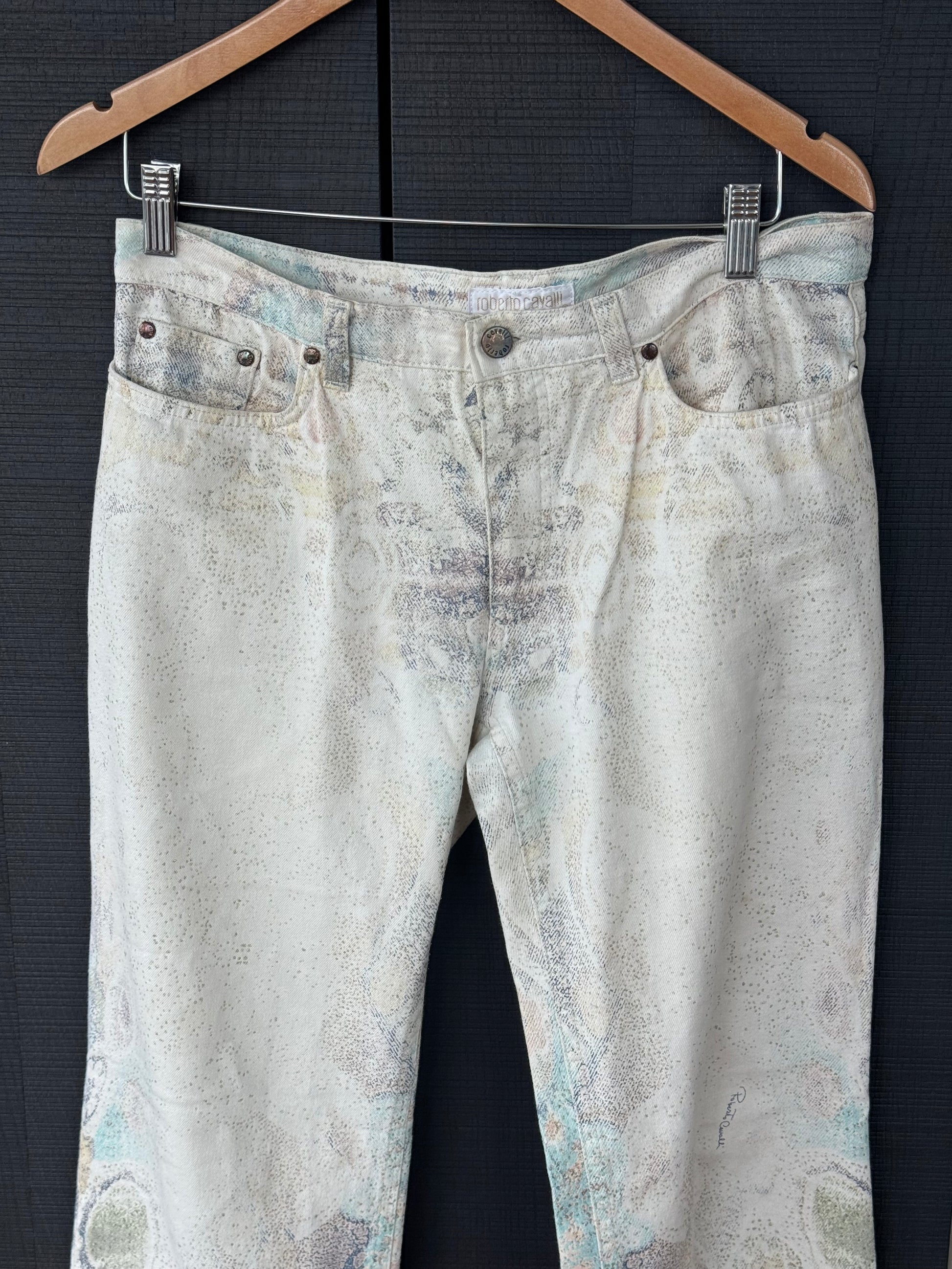 Iconic vintage Roberto Cavalli jeans featuring a dreamy psychedelic print in soft pastel tones.